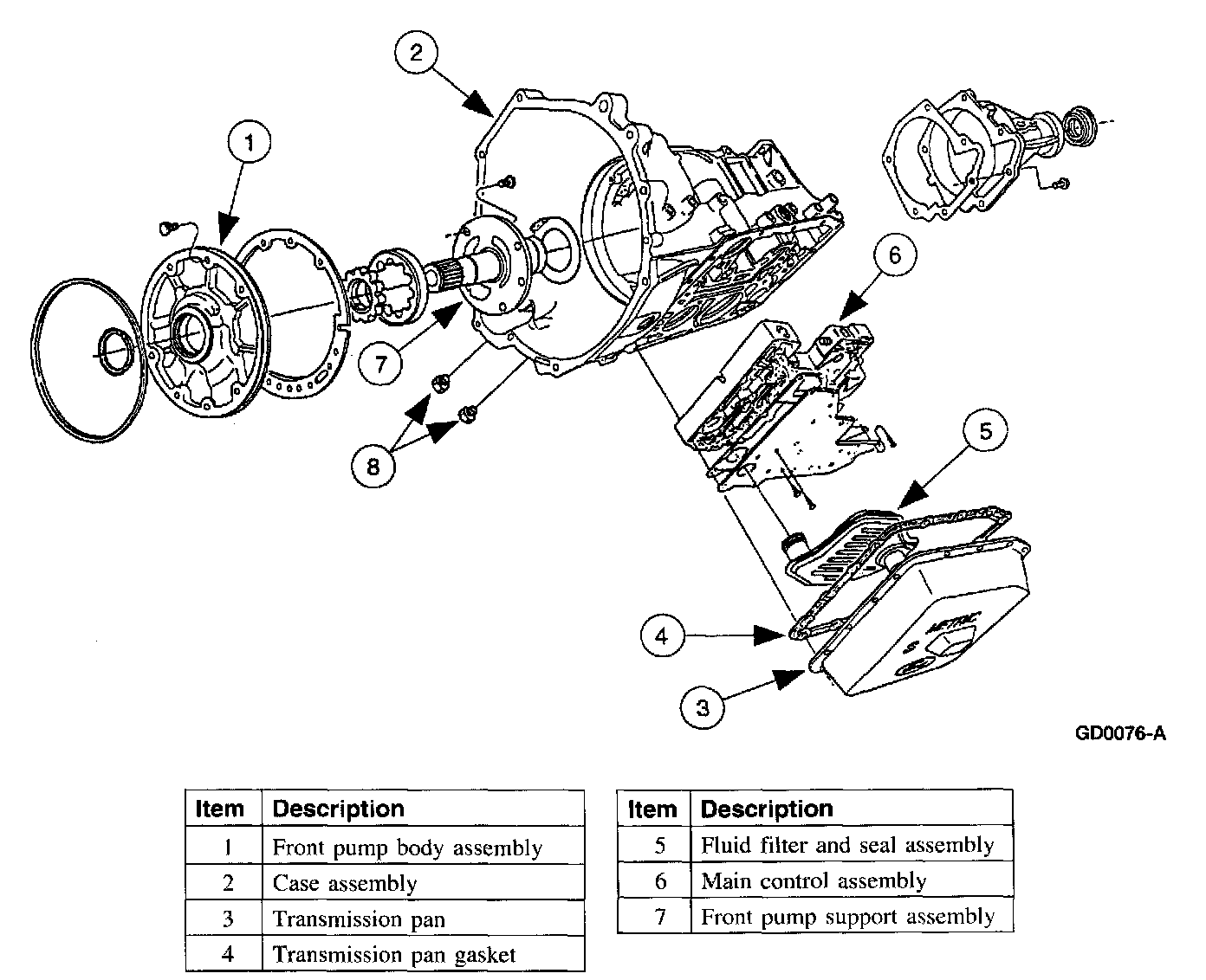 The transmission uses a gerotor-type design front pump support and gear. The pump provides the volume of fluid needed to charge the torque converter, main control assembly, cooling system and lube system. Pump pressure is regulated by the main regulator valve. The pump has an internal boost circuit which is more efficient at lower engine speeds.