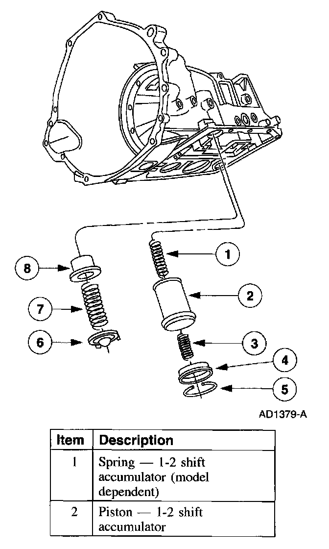^ 1-2 Accumulator - The 1-2 accumulator is used to soften the 1-2 shift by absorbing some of the pressure directed to the intermediate clutch. Constant line pressure is applied to the middle section of the 1-2 accumulator piston, opposing the intermediate clutch pressure, until the pressure is high enough to overcome line pressure. The top of the piston is exhausted to the sump.