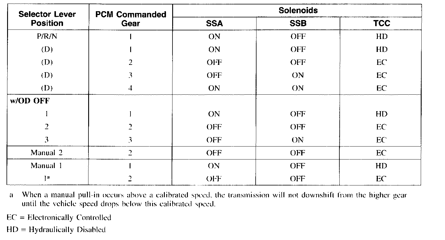 Using all of these input signals, the PCM can determine when the time and conditions are right for a shift, or when to apply or release the Torque Converter Clutch (TCC). It will also determine the best line pressure needed to optimize shift feel. To accomplish this, the PCM uses hydraulic solenoids to control transmission operation.