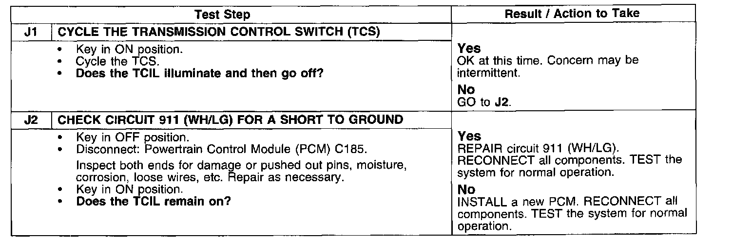 PINPOINT TEST J: THE TRANSMISSION CONTROL INDICATOR LAMP (TCIL) IS ILLUMINATED CONTINUOUSLY - FLOOR SHIFT