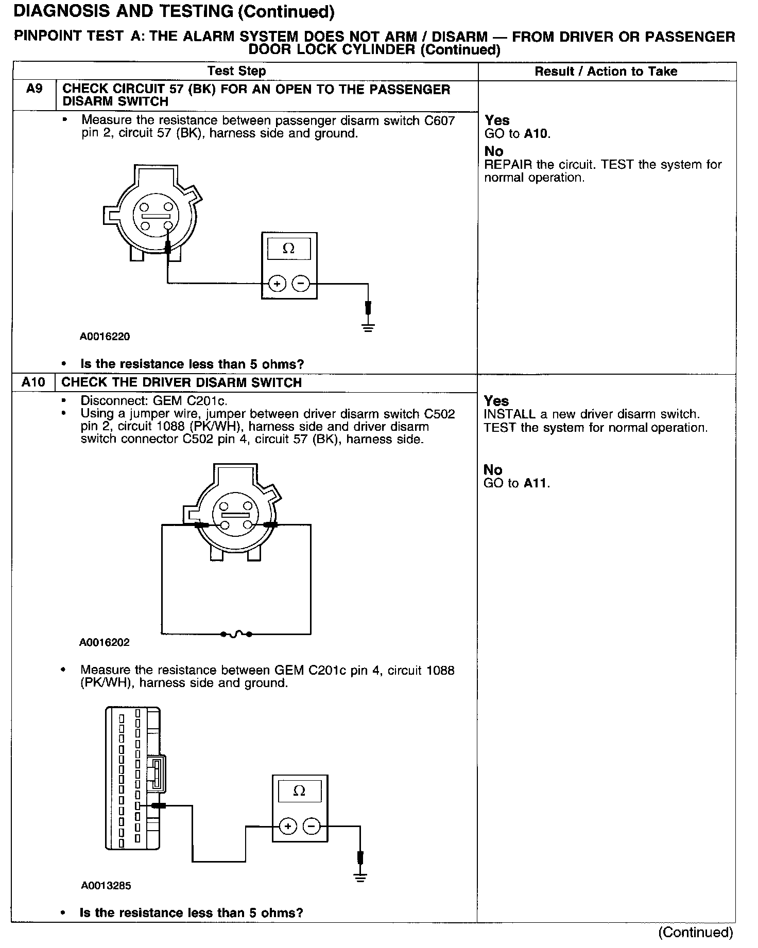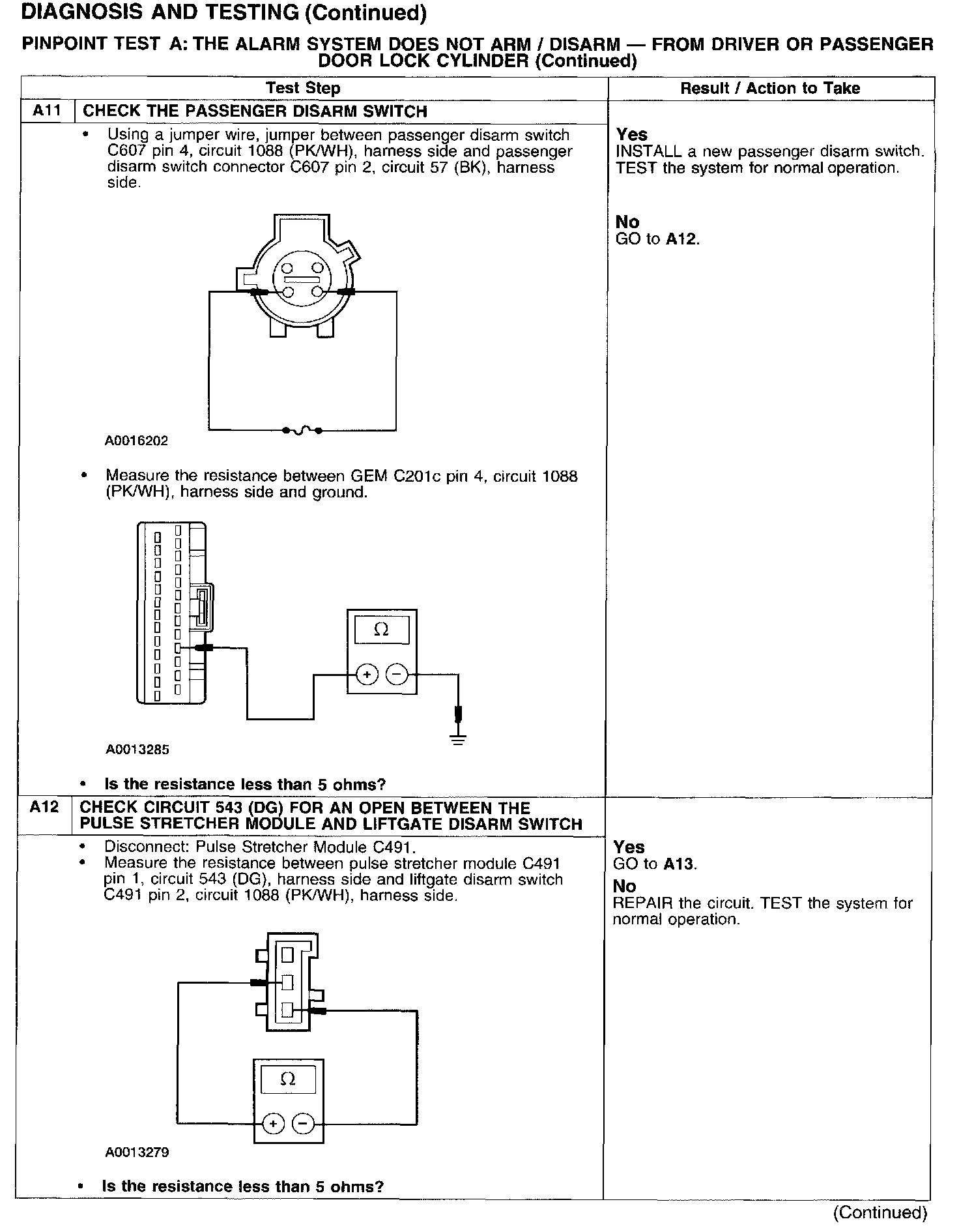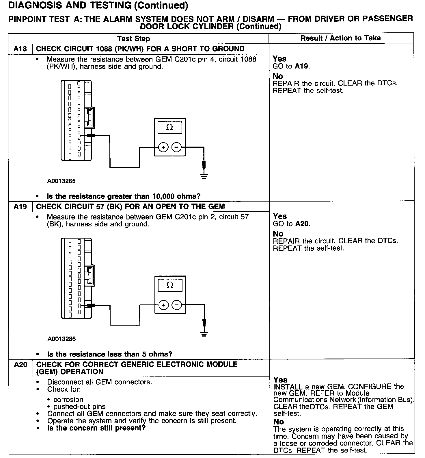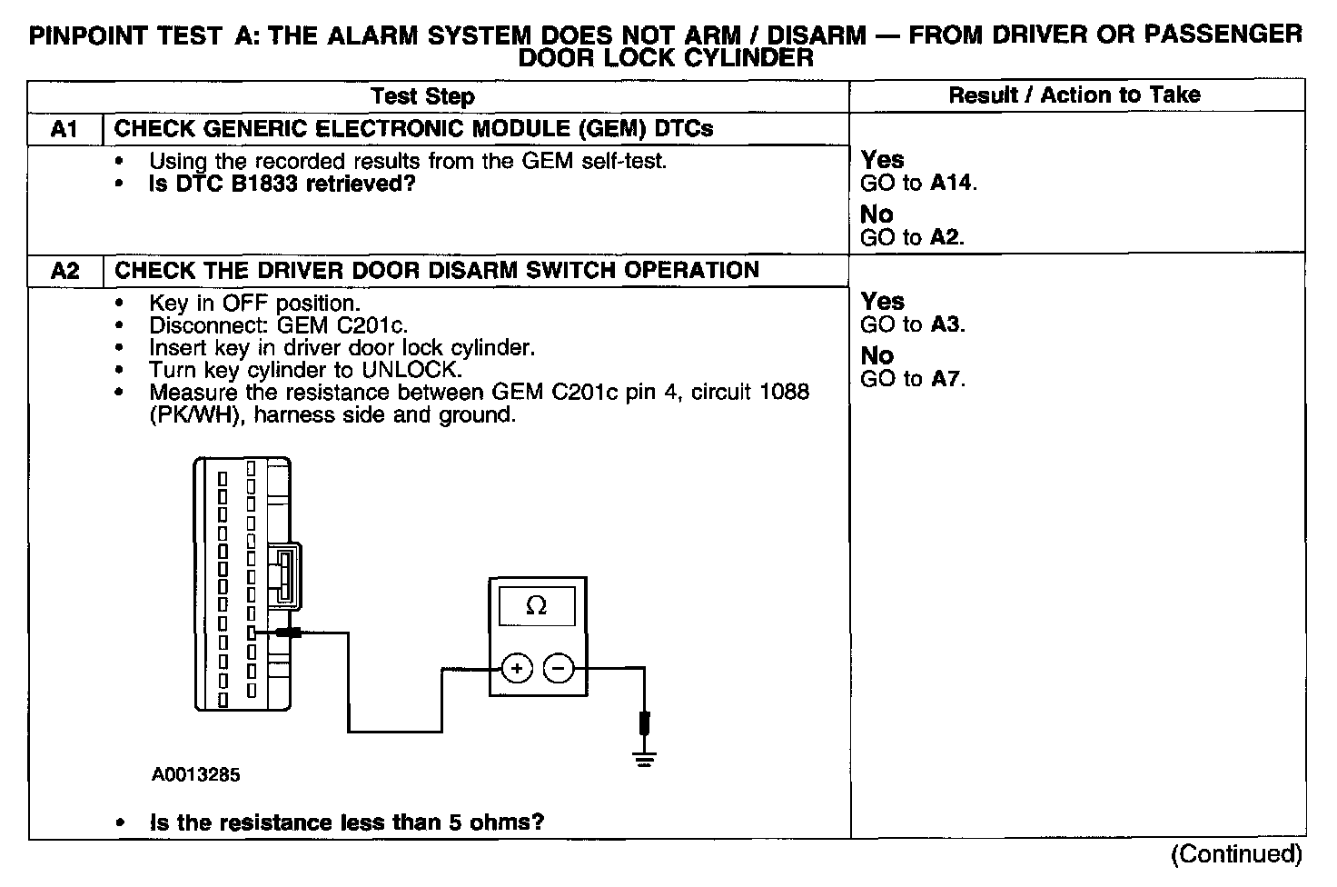 PINPOINT TEST A: THE ALARM SYSTEM DOES NOT ARM/DISARM - FROM DRIVER OR PASSENGER DOOR LOCK CYLINDER