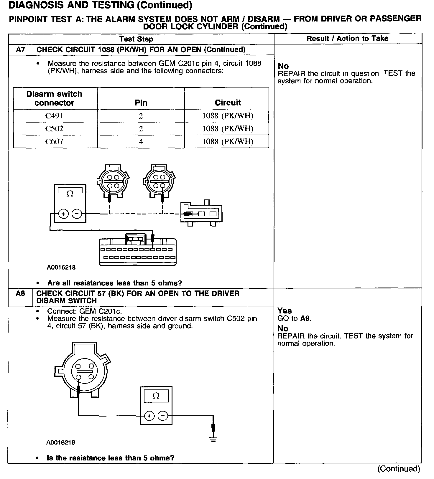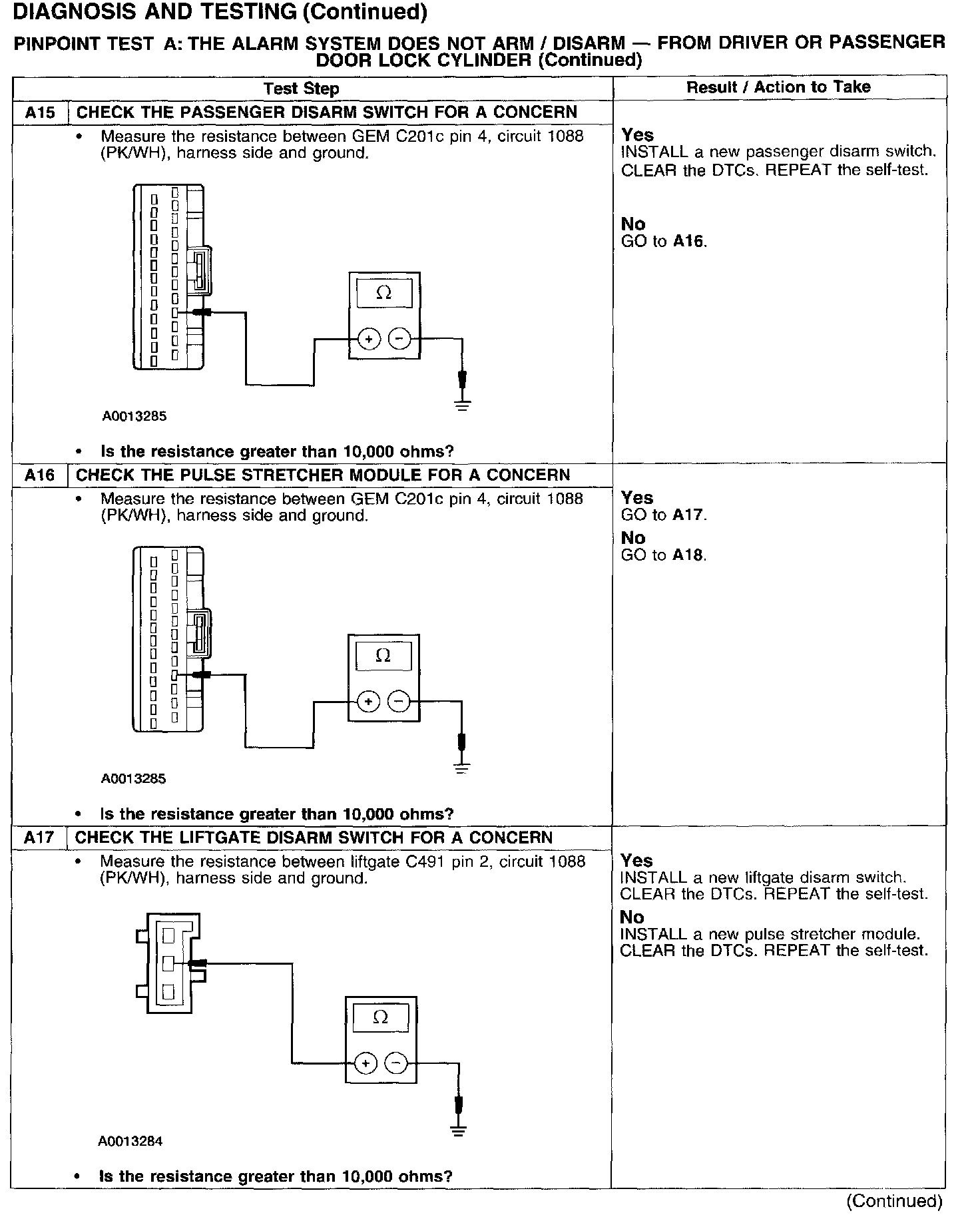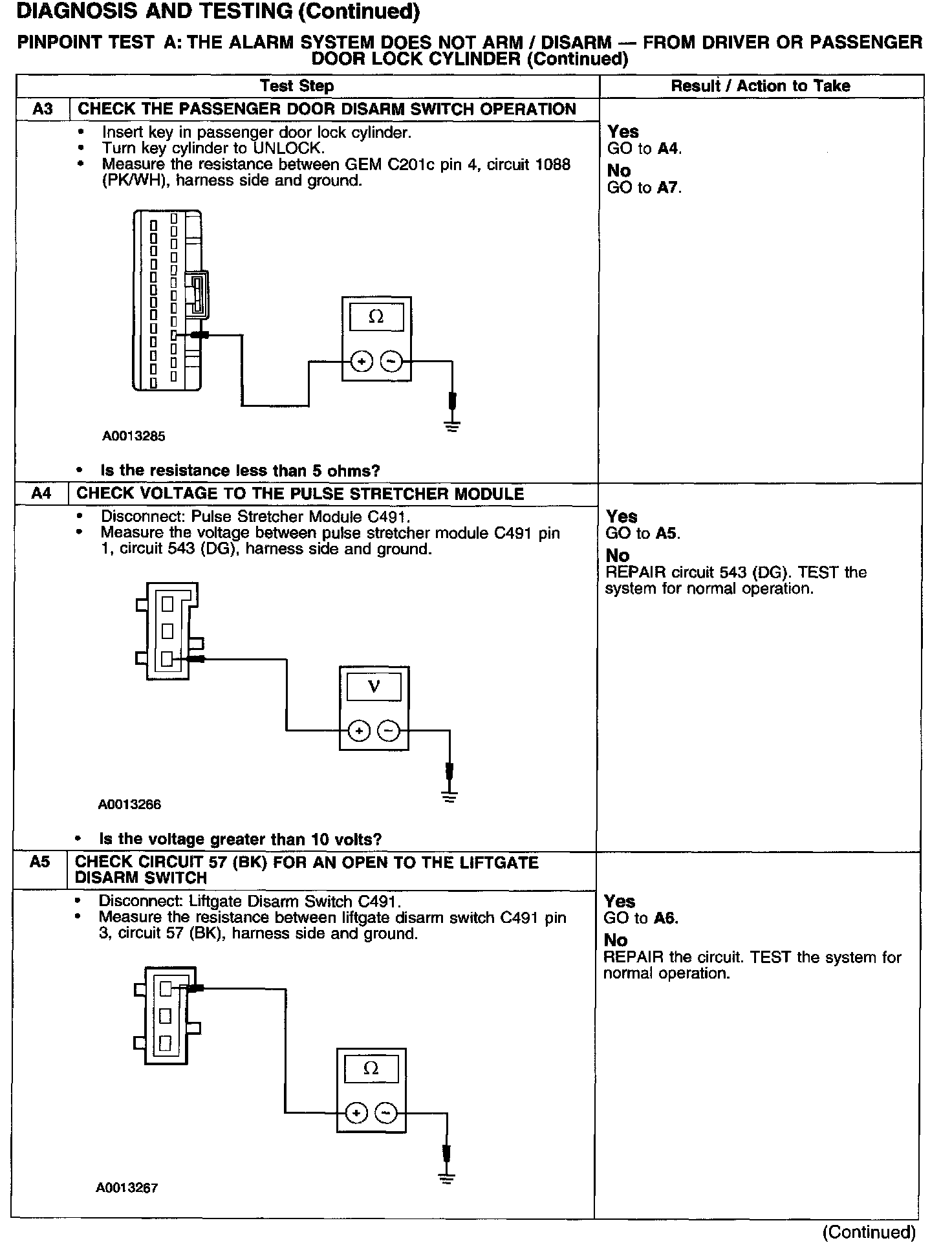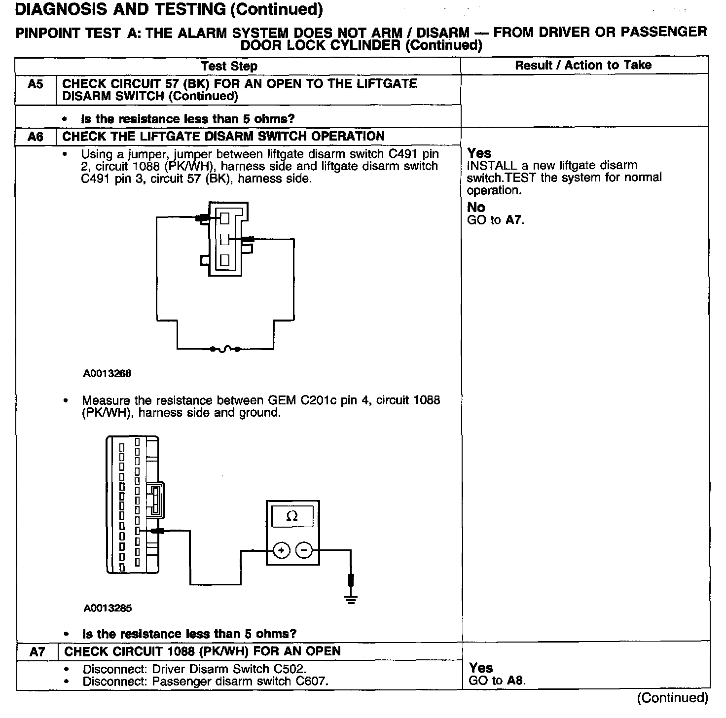 PINPOINT TEST A: THE ALARM SYSTEM DOES NOT ARM/DISARM - FROM DRIVER OR PASSENGER DOOR LOCK CYLINDER