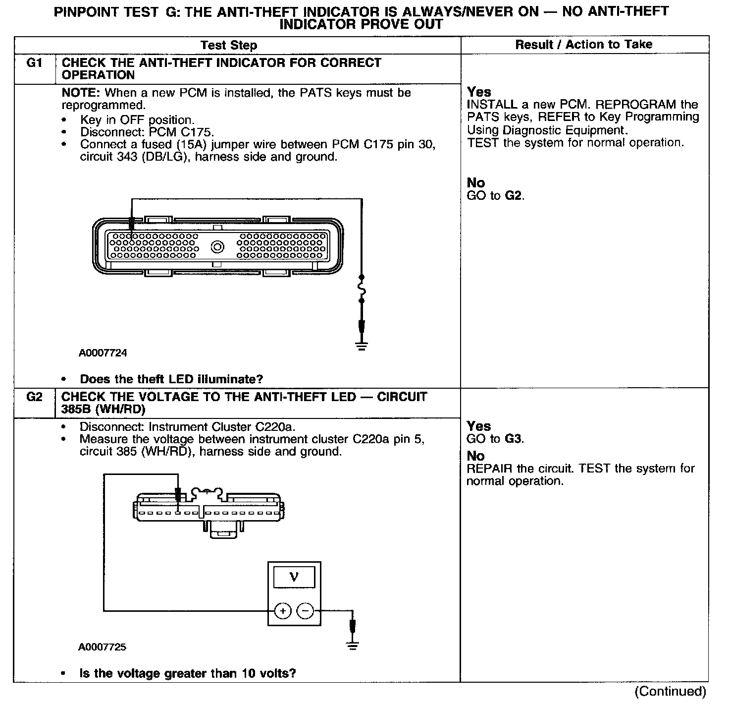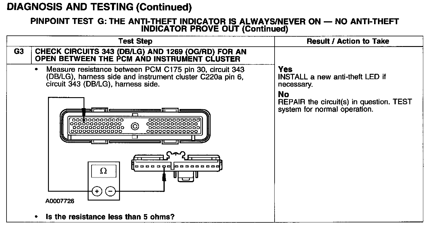 PINPOINT TEST G: THE ANTI-THEFT INDICATOR IS ALWAYS/NEVER ON - NO ANTI-THEFT INDICATOR PROVE OUT
