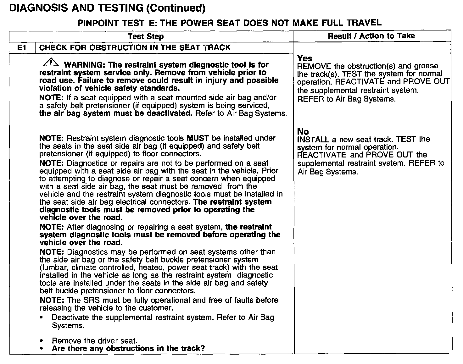 PINPOINT TEST E: THE POWER SEAT DOES NOT MAKE FULL TRAVEL