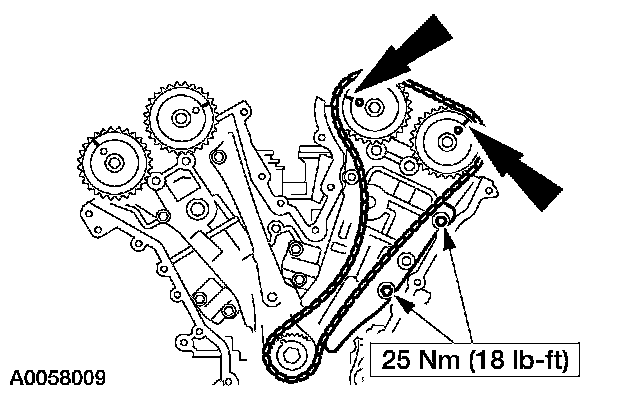 12. Install the RH timing chain tensioner and tensioner arm.
