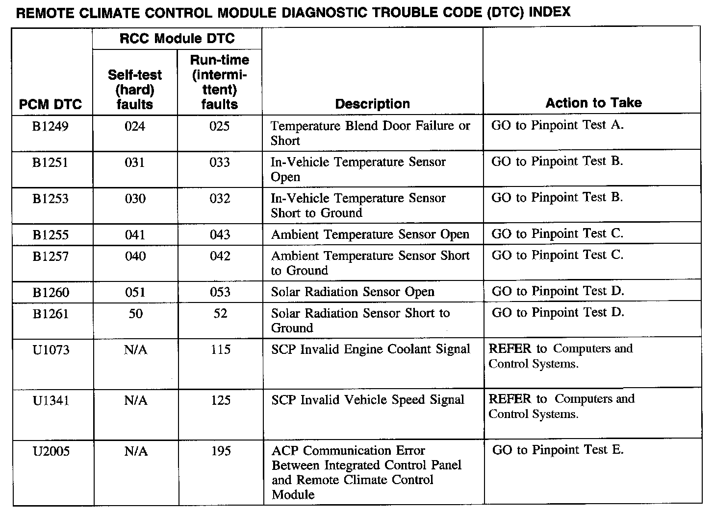 Remote Climate Control Module Diagnostic Trouble Code Index