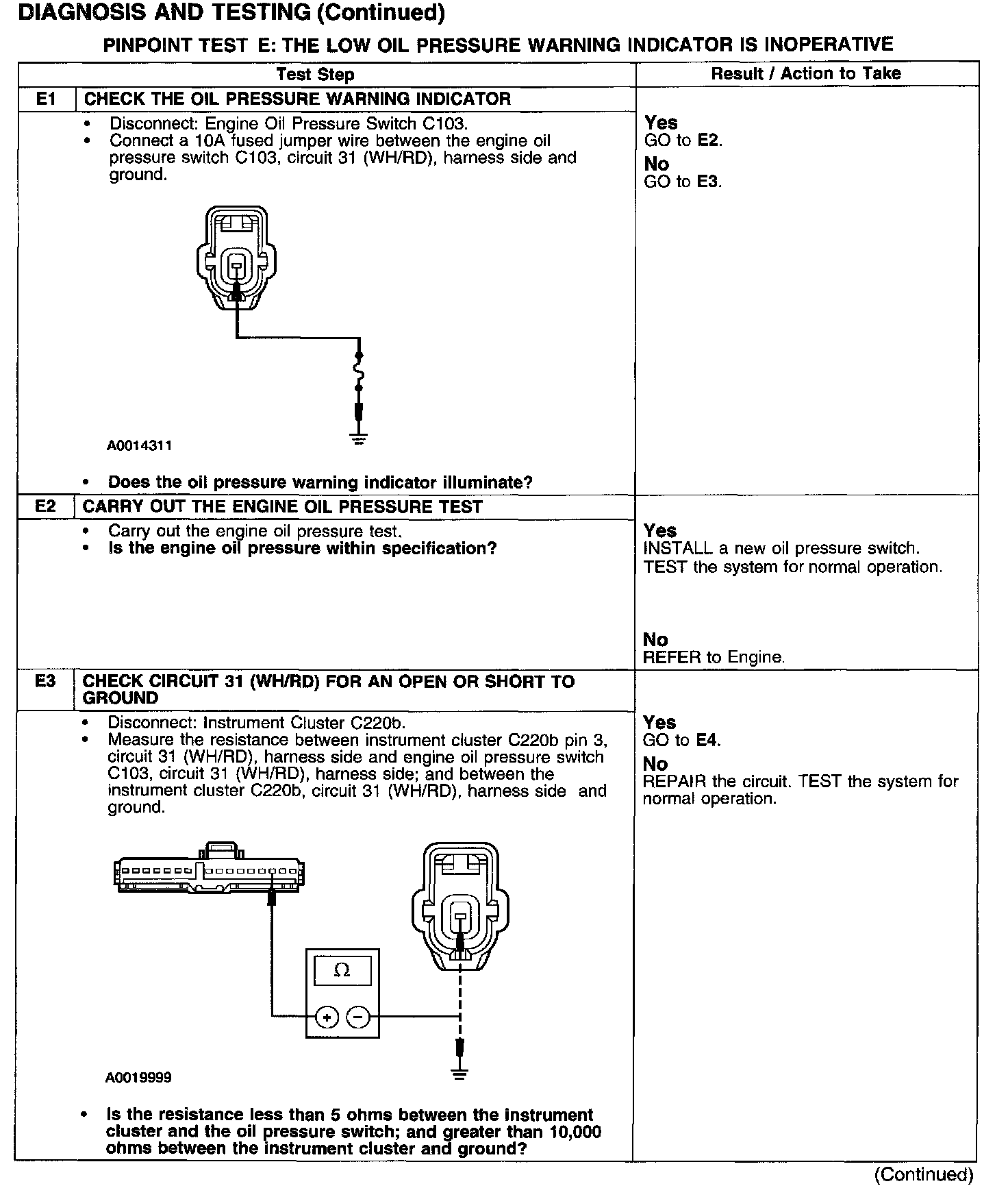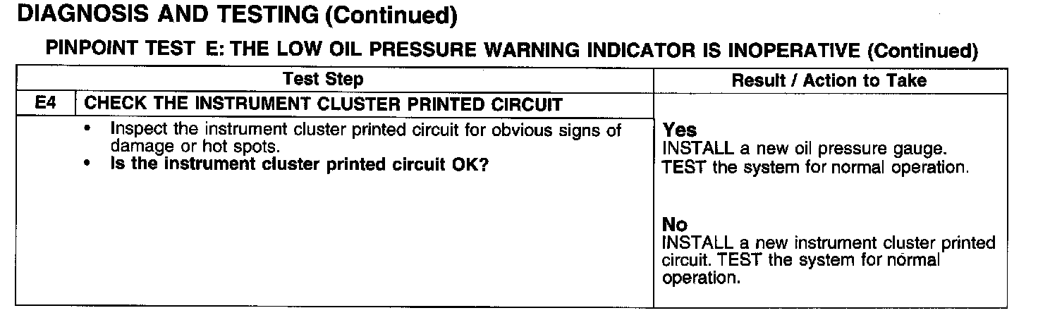 PINPOINT TEST E: THE LOW OIL PRESSURE WARNING INDICATOR IS INOPERATIVE