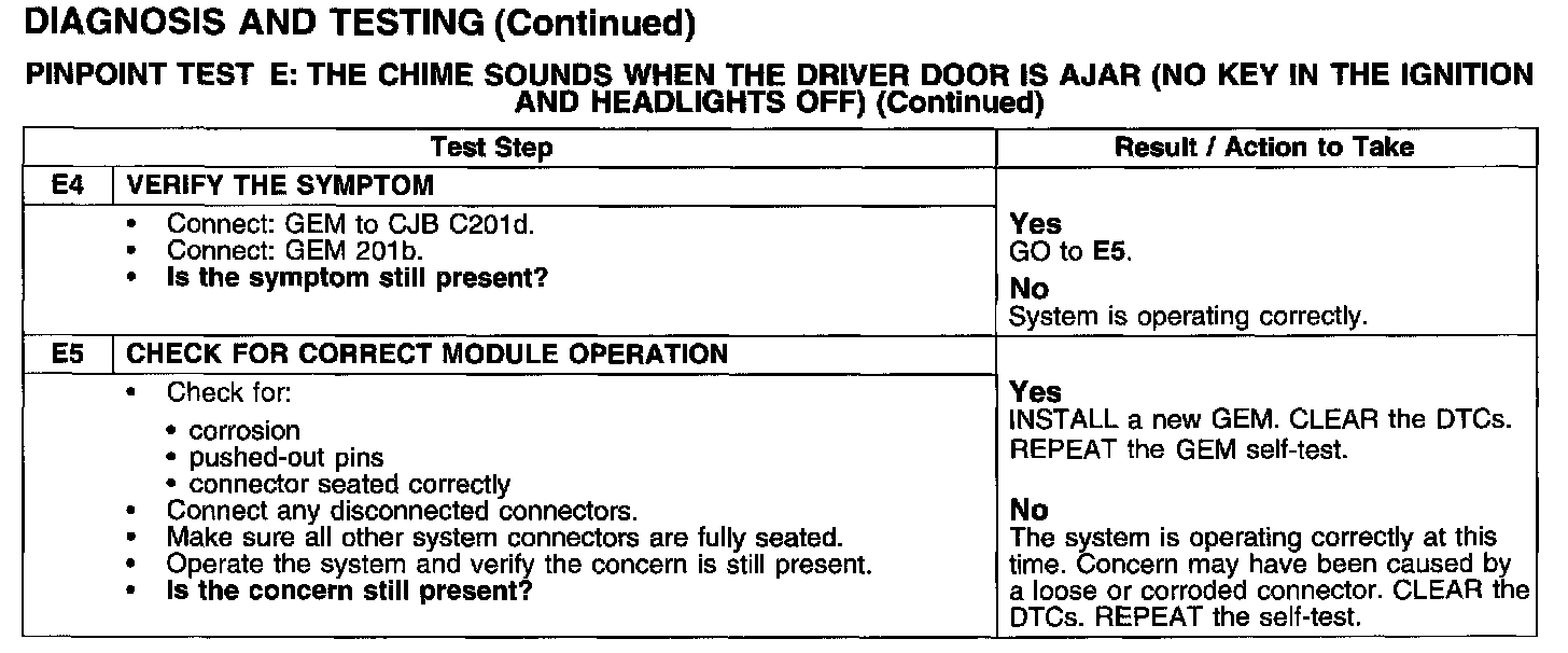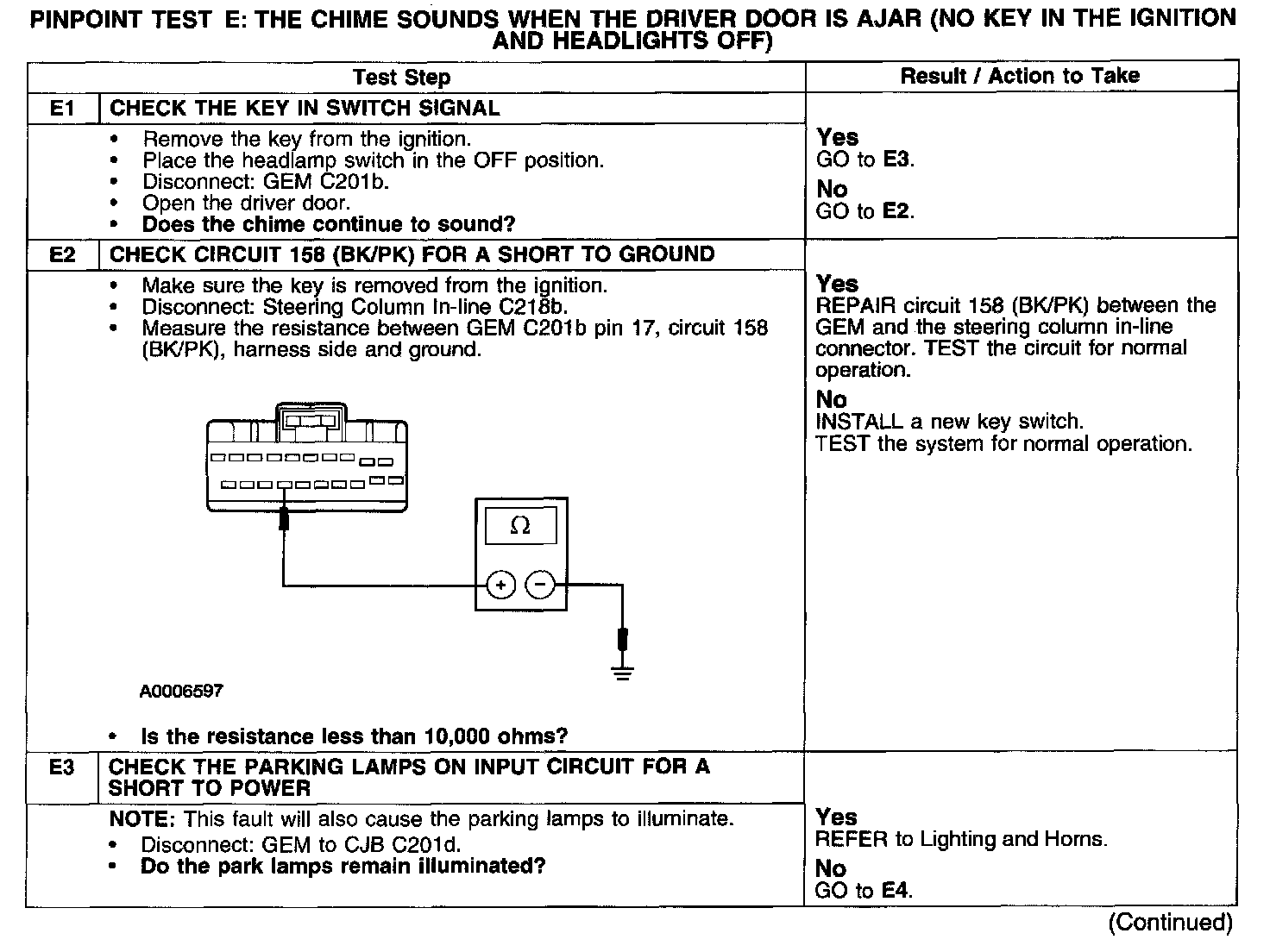 PINPOINT TEST E: CHIME SOUNDS WHEN THE DRIVER DOOR IS AJAR (NO KEY IN THE IGNITION AND HEADLIGHTS OFF)