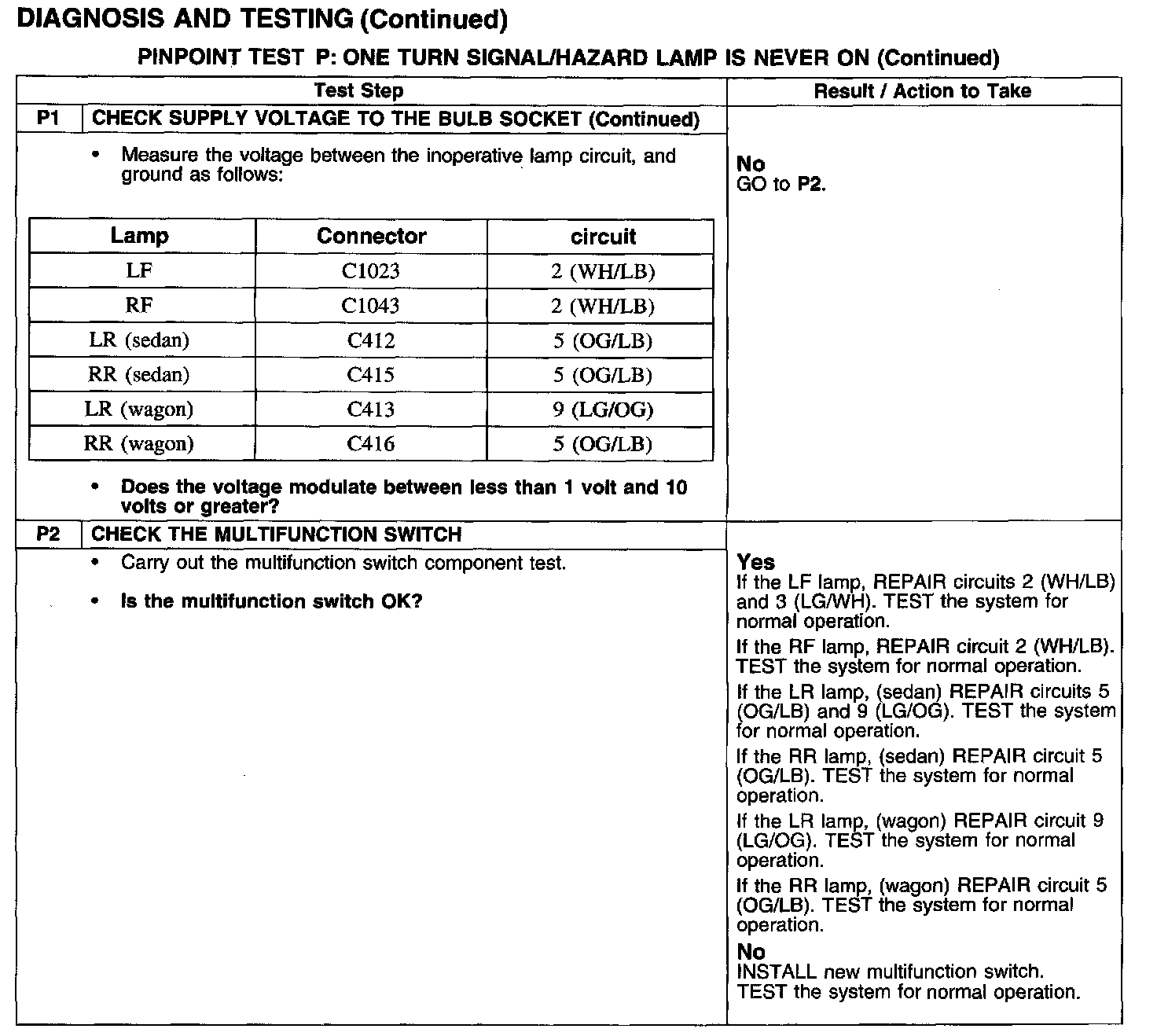 PINPOINT TEST P: ONE TURN SIGNAL/HAZARD LAMP IS NEVER ON