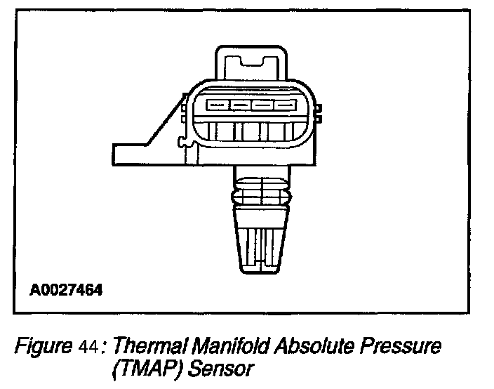 The Thermal Manifold Absolute Pressure Sensor (TMAP) (Figure 44) consists of a manifold absolute pressure (MAP) sensor and an integrated thermistor. The MAP portion of the sensor uses a piezo-resistive silicon sensing element to provide a voltage proportional to the absolute pressure in the intake manifold. The thermistor portion of the sensor operates in the same manner as an intake air temperature (IAT) sensor. For additional information on how the IAT sensor operates, refer to the Intake Air Temperature Sensor description and operation.