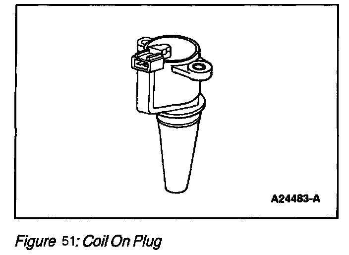 The Coil On Plug (COP) (Figure 51) ignition operates similar to standard coil pack ignition except each plug has one coil per plug. COP has three different modes of operation: engine crank, engine running, and CMP Failure Mode Effects Management (FMEM).
