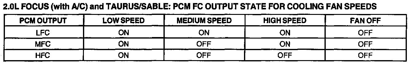 2.0L Focus (With A/C) And Taurus/Sable: PCM FC Output State For Cooling Fan Speeds Chart:
