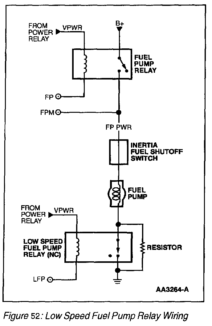 For applications with two speed fuel pumps, a normally closed low speed fuel pump relay (Figure 52) is wired into the fuel pump ground circuit. With the low speed fuel pump relay contacts in the normally closed position, there is no extra resistance in the ground circuit for high speed operation. For low speed fuel pump operation, the PCM will ground the Low Fuel Pump (LFP) circuit, which opens the relay contacts. With the relay contacts open, the fuel pump ground circuit now passes through a resistor that is wired into the circuit.