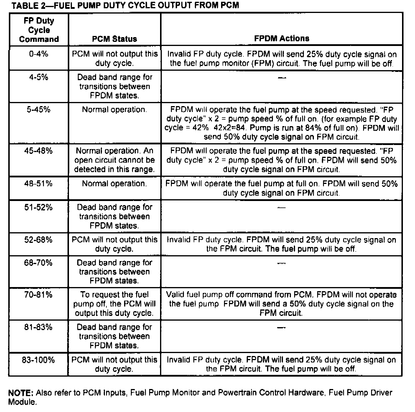 The Fuel Pump (FP) signal is a duty cycle command sent from the powertrain control module (PCM) to the fuel pump driver module (FPDM) (Table 2). The FPDM uses the FP command to operate the fuel pump at the speed requested by the PCM or to turn the pump off.