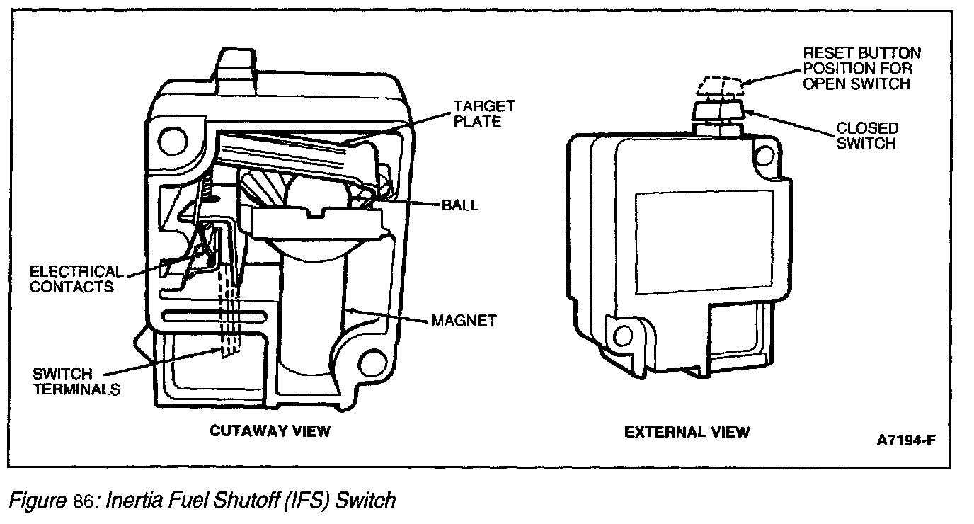 The inertia fuel shutoff (IFS) switch (Figure 85) is used in conjunction with electric fuel close valves. The purpose of the IFS switch is to close the fuel shut-off valves if a crash occurs. It consists of a steel ball held in place by a magnet. When a sharp impact occurs, the ball breaks loose from the magnet, rolls up a conical ramp and strikes a target plate which opens the electrical contacts of the switch and closes the electric fuel shut-off valve. Once the switch is open, it must be manually reset before restarting the vehicle. On some vehicles a fuel reset light illuminates. Refer to the Owner Guide for the location of the IFS.
