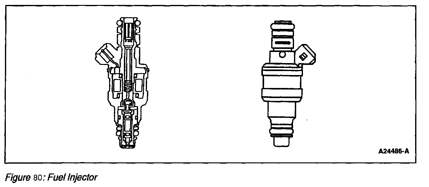 The fuel injector (Figure 79) is a solenoid-operated valve that meters fuel flow to the engine. The fuel injector is opened and closed every other crankshaft revolution. The amount of fuel is controlled by the length of time the fuel injector is held open.