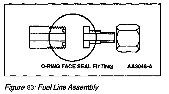 A fuel line assembly (Figure 82) consists of flexible hose and/or stainless steel seamless tubing, end fittings and tube nuts. The hose is a conductive polytetrafluoroethylene (PTFE) liner reinforced with a stainless steel wire braided covering. The fittings are inserted into the hose ends and crimped into place. The stainless steel tubing contains end fittings which are brazed to the tube. There are high pressure fuel lines that are identified by either 1/4-inch or 3/8-inch outer diameter and a low pressure fuel line identified by a 1/2-inch outer diameter. The low pressure fuel line has a quick-connect at one end for connection to the fuel rail. The other fittings used on the natural gas vehicle to connect fuel components are SAE O-ring face seal tube fittings. There are two end types: an O-ring face seal end and a straight thread end. On tee and elbow fittings, a washer and a positionable nut are provided to aid in orientation of the fitting.