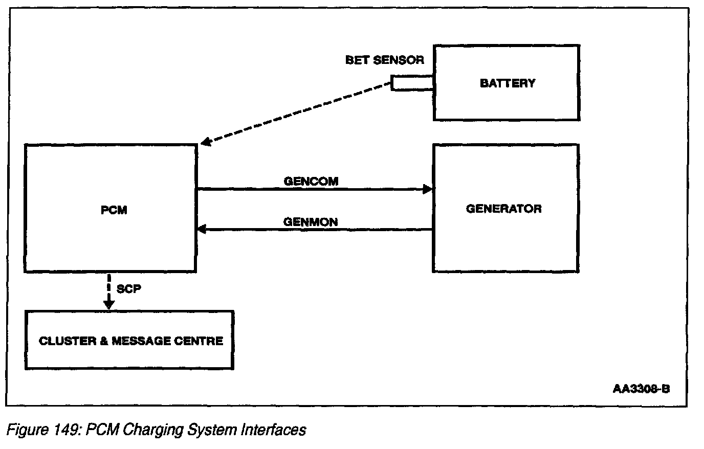 The Powertrain Control Module (PCM)- Controlled charging system (Figure 147) provides many additional benefits over the current Integral Generator Regulator system. The first benefit is improved battery life. In an integral generator regulator system, the regulator set point is established by a temperature sensor in the regulator which estimates battery temperature. Field data has shown this approach lacks accuracy. With a PCM-Controlled generator, the regulator voltage set point is determined by the PCM and communicated to the regulator via the generator communication line. The PCM will use a calibratable algorithm to estimate battery temperature. Improving battery temperature estimates will reduce battery damage caused by over- and undercharging.