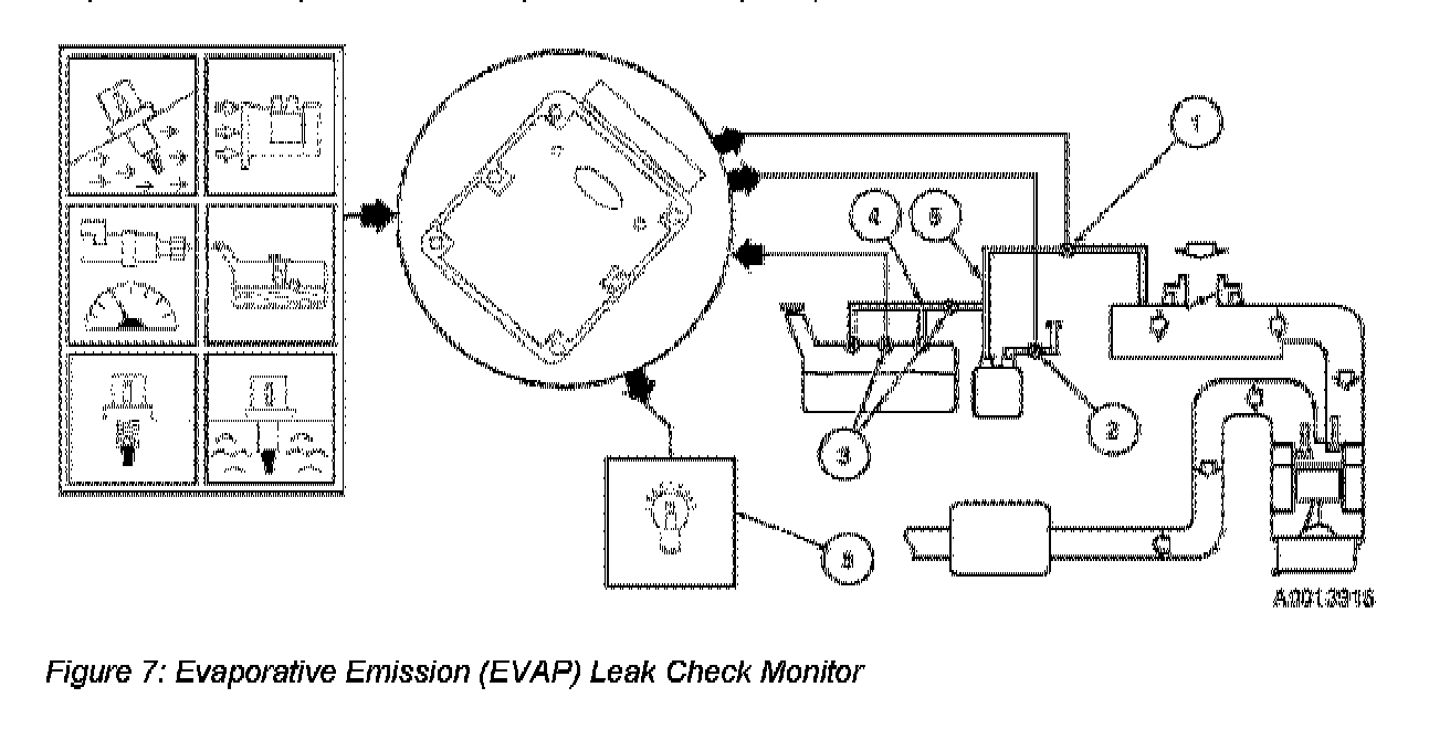 The Evaporative Emission (EVAP) Leak Check Monitor is an on-board strategy designed to detect a leak from a hole (opening) equal to or greater than 1.016 mm (0.040 inch) in the Enhanced EVAP system. The proper function of the individual components of the Enhanced EVAP system as well as its ability to flow fuel vapor to the engine is also examined. The EVAP Leak Check Monitor relies on the individual components of the Enhanced EVAP system to apply vacuum to the fuel tank and then seal the entire Enhanced EVAP system from atmosphere. The fuel tank pressure is then monitored to determine the total vacuum lost (bleed-up) for a calibrated period of time. Inputs from the engine coolant temperature (ECT) or cylinder head temperature (CHT) sensor, intake air temperature (IAT) sensor, mass air flow (MAF) sensor, vehicle speed, fuel level input (FLI) and fuel tank pressure (FTP) sensor are required to enable the EVAP Leak Check Monitor.