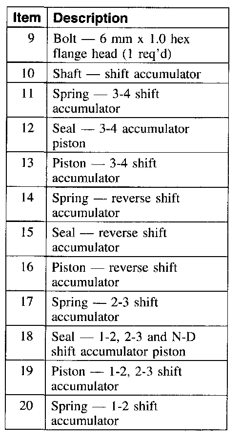 AccumulatorsThe hydraulic system has accumulators in circuits for five apply components. Each accumulator has a piston (with seal and spring) positioned on a hollow shaft. The low-intermediate (N-D) accumulator is located in the bottom of the transaxle case. The chain cover and side of the transaxle case contain four accumulators: