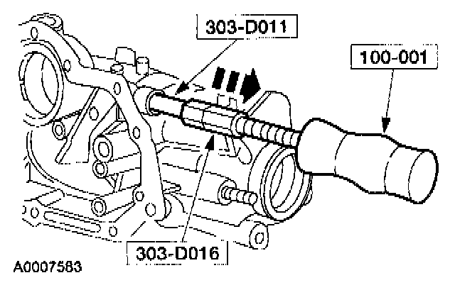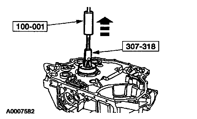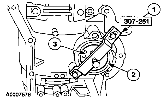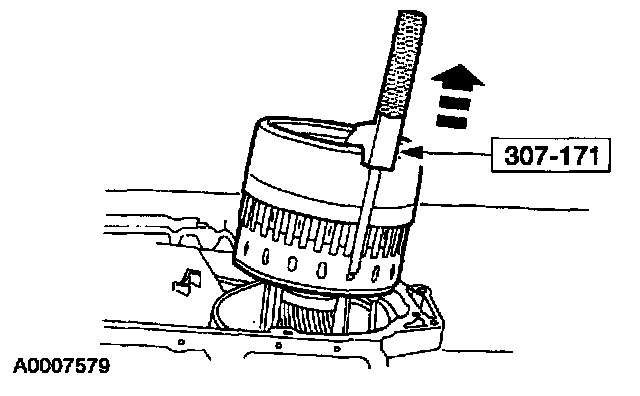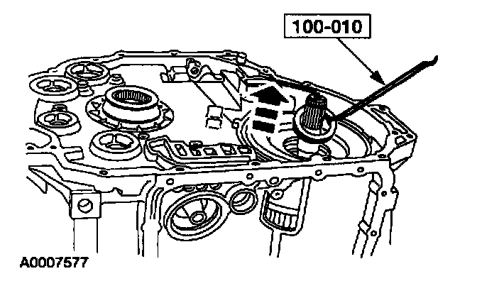 Position the special tool into the case and install the hook end of tool into one of the lube holes in the front sun shell. Position the block over the edge of the assembly and tighten the handle.
