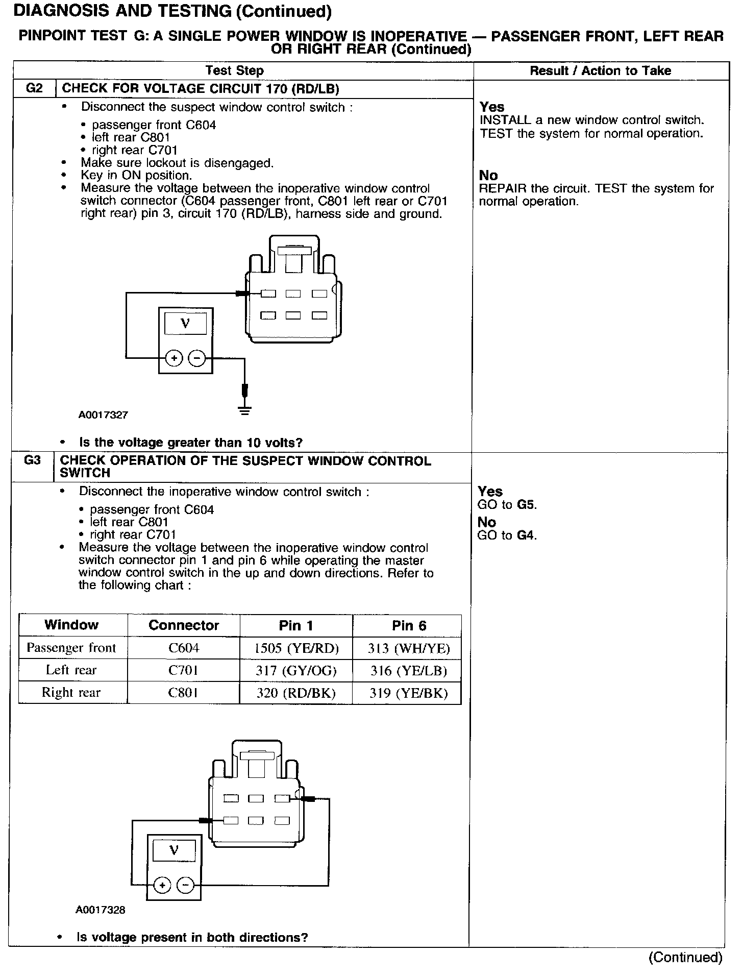 PINPOINT TEST G: A SINGLE POWER WINDOW IS INOPERATIVE - PASSENGER FRONT, LEFT REAR OR RIGHT REAR