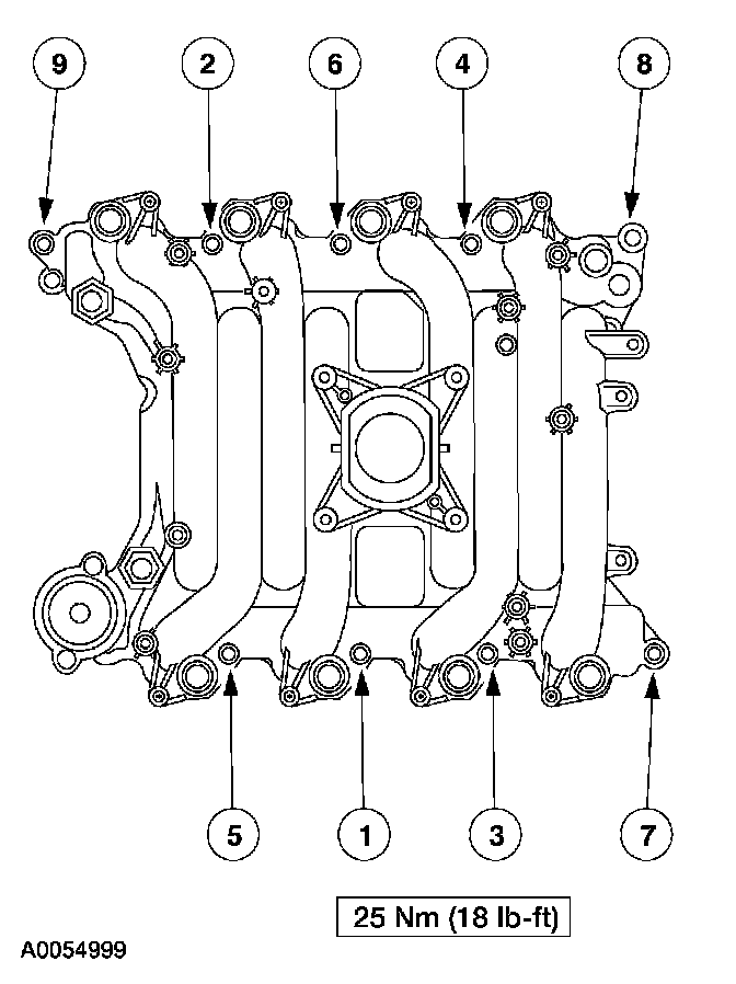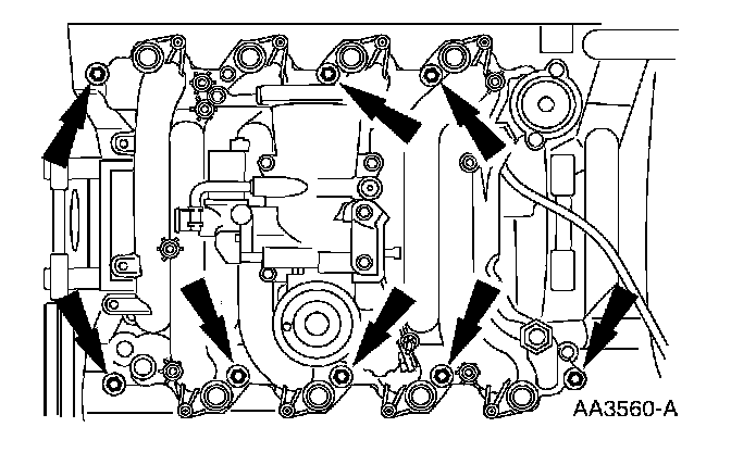 51. Install the intake manifold and hand-tighten the bolts at the locations shown.