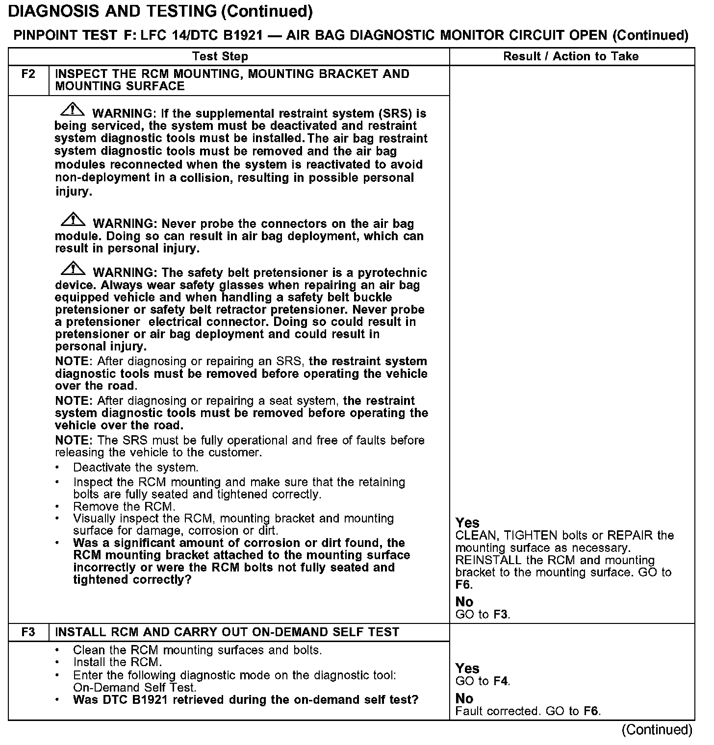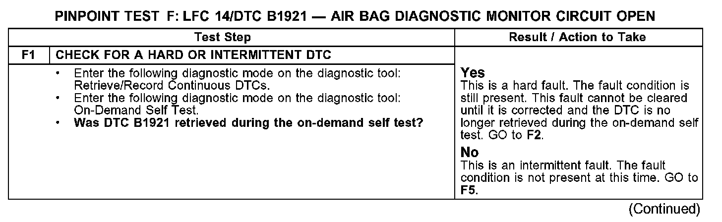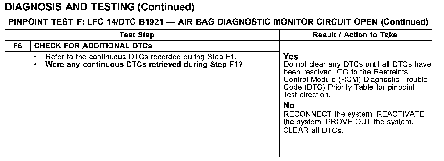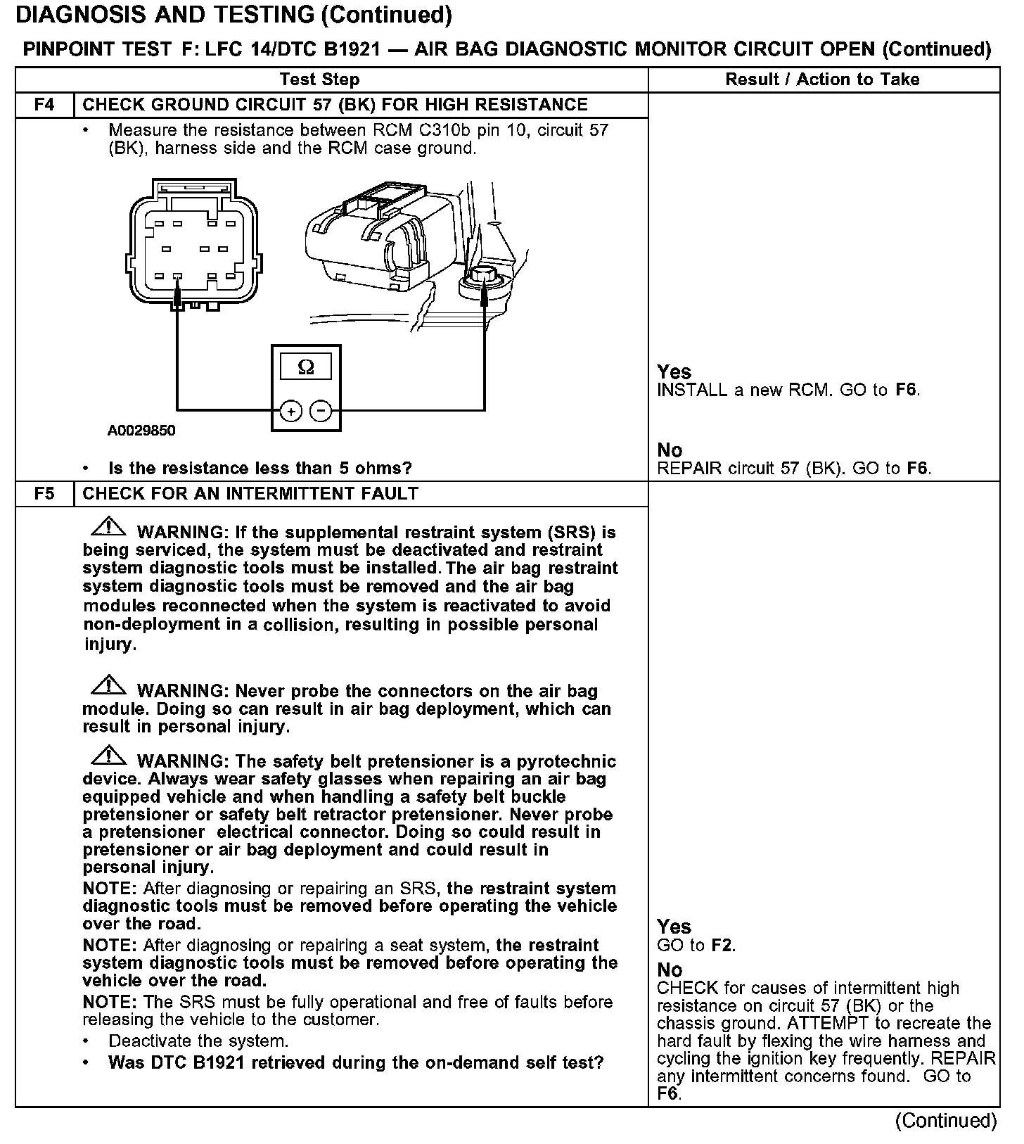 PINPOINT TEST F: LFC 14/DTC B1921 - AIR BAG DIAGNOSTIC MONITOR GROUND CIRCUIT OPEN