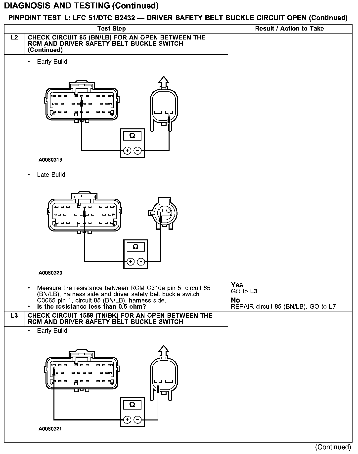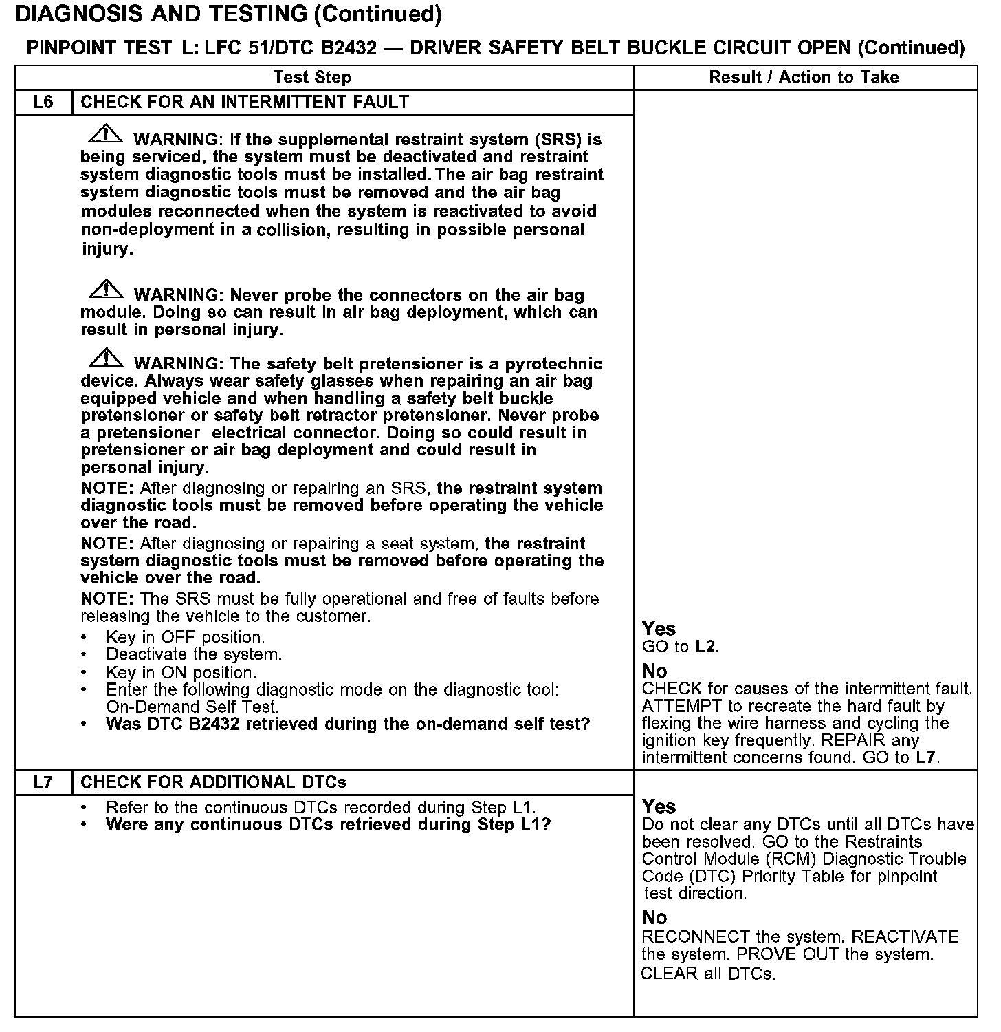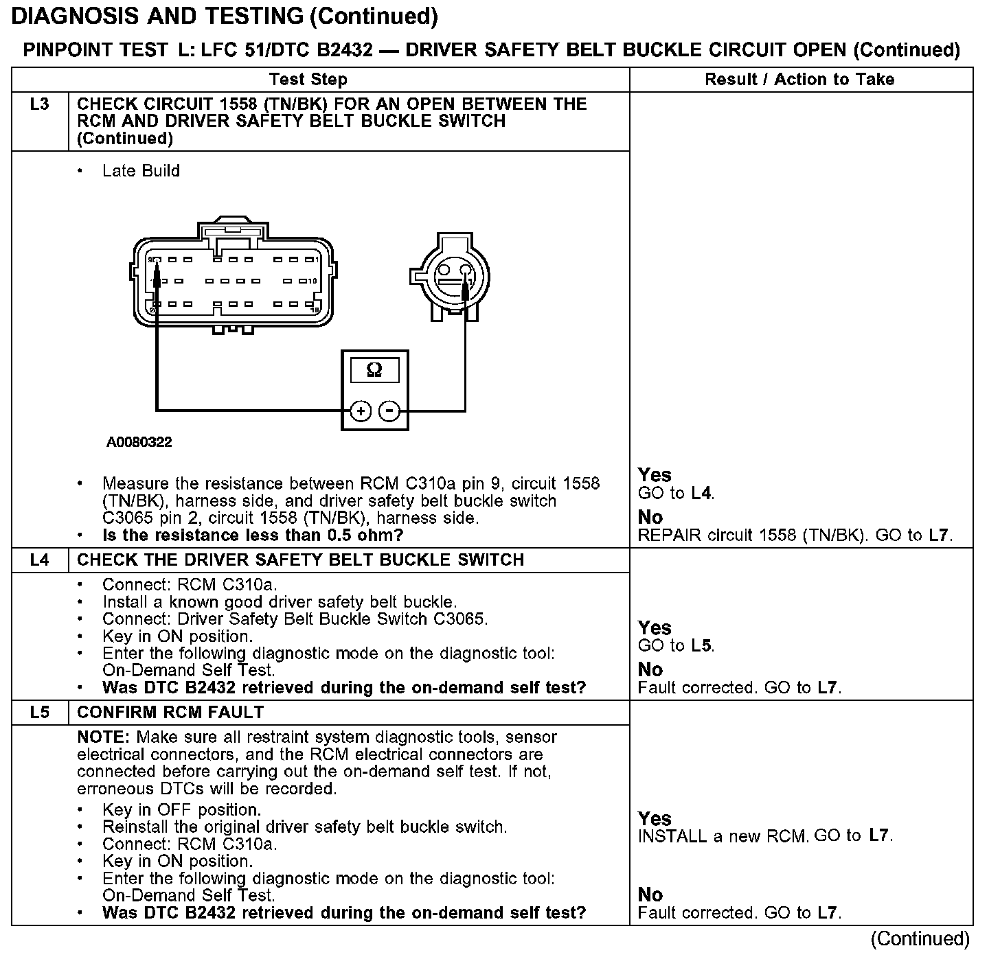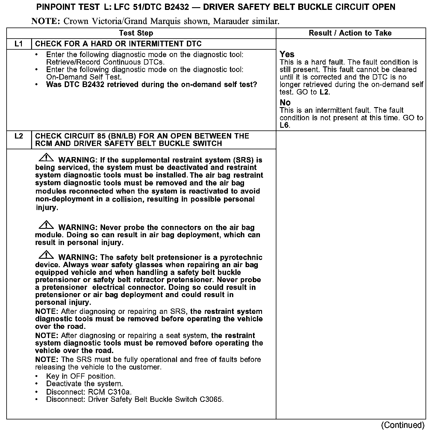 PINPOINT TEST L: LFC 51/DTC B2432 - DRIVER SAFETY BELT BUCKLE SWITCH CIRCUIT OPENTest L1-L2: