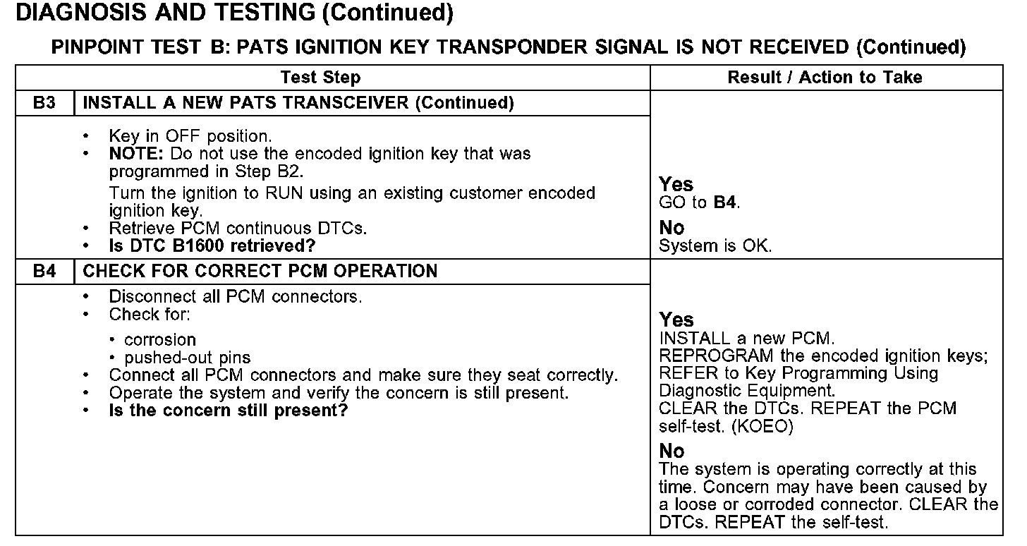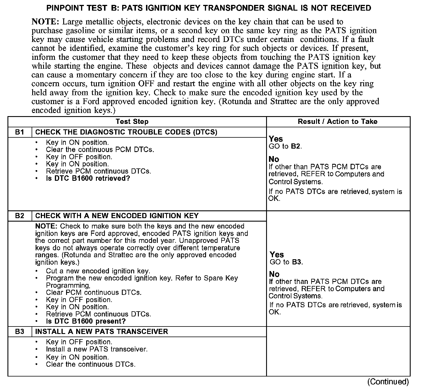 PINPOINT TEST B: PATS IGNITION KEY TRANSPONDER SIGNAL IS NOT RECEIVED