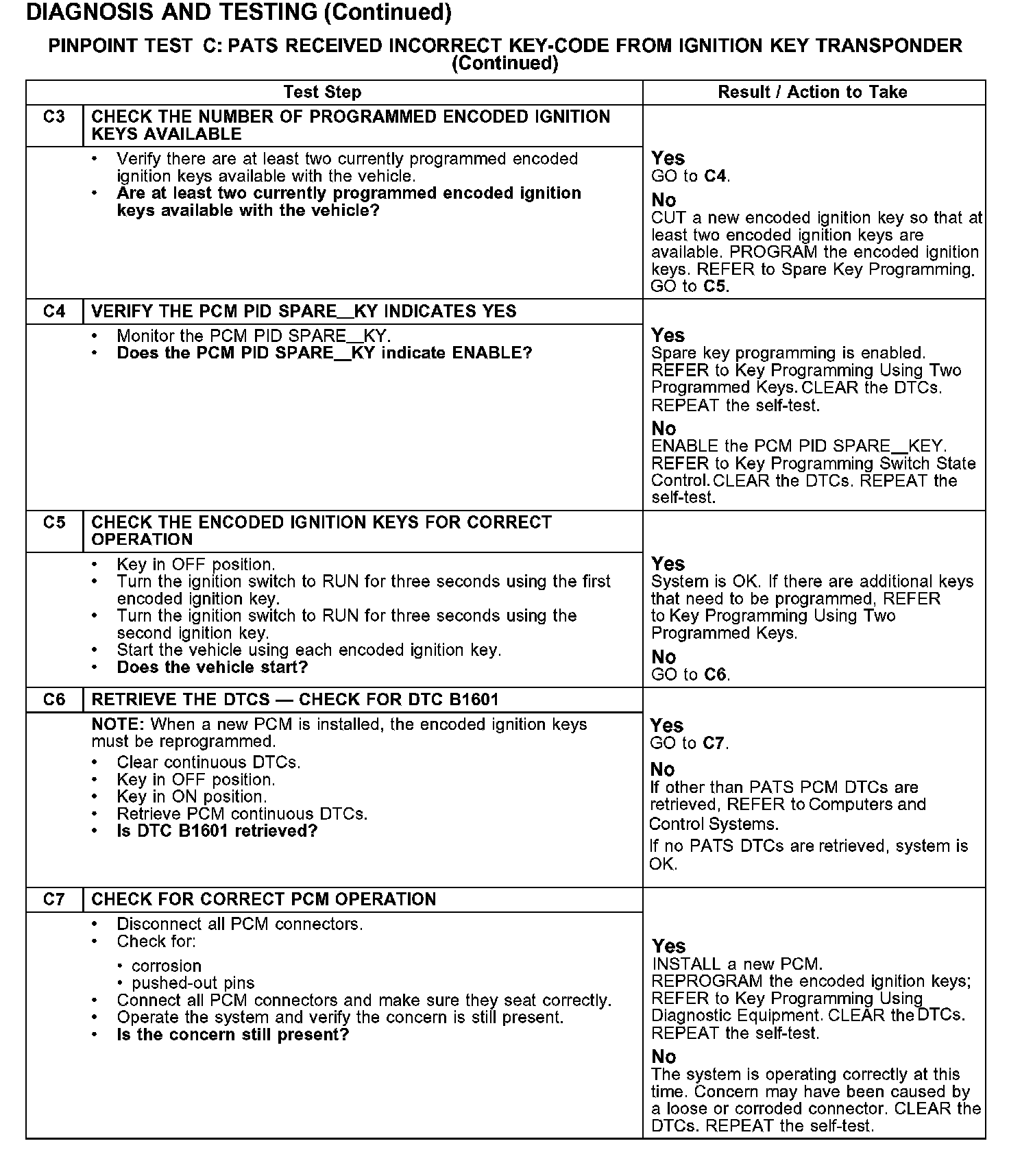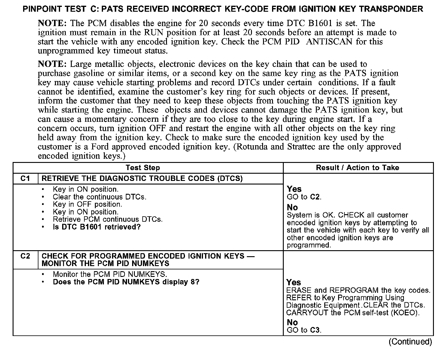 PINPOINT TEST C: PATS RECEIVED INCORRECT KEY-CODE FROM IGNITION KEY TRANSPONDER
