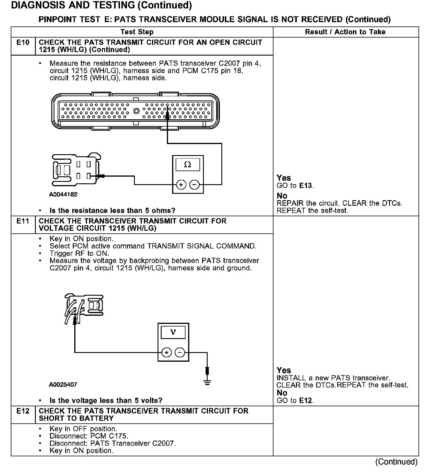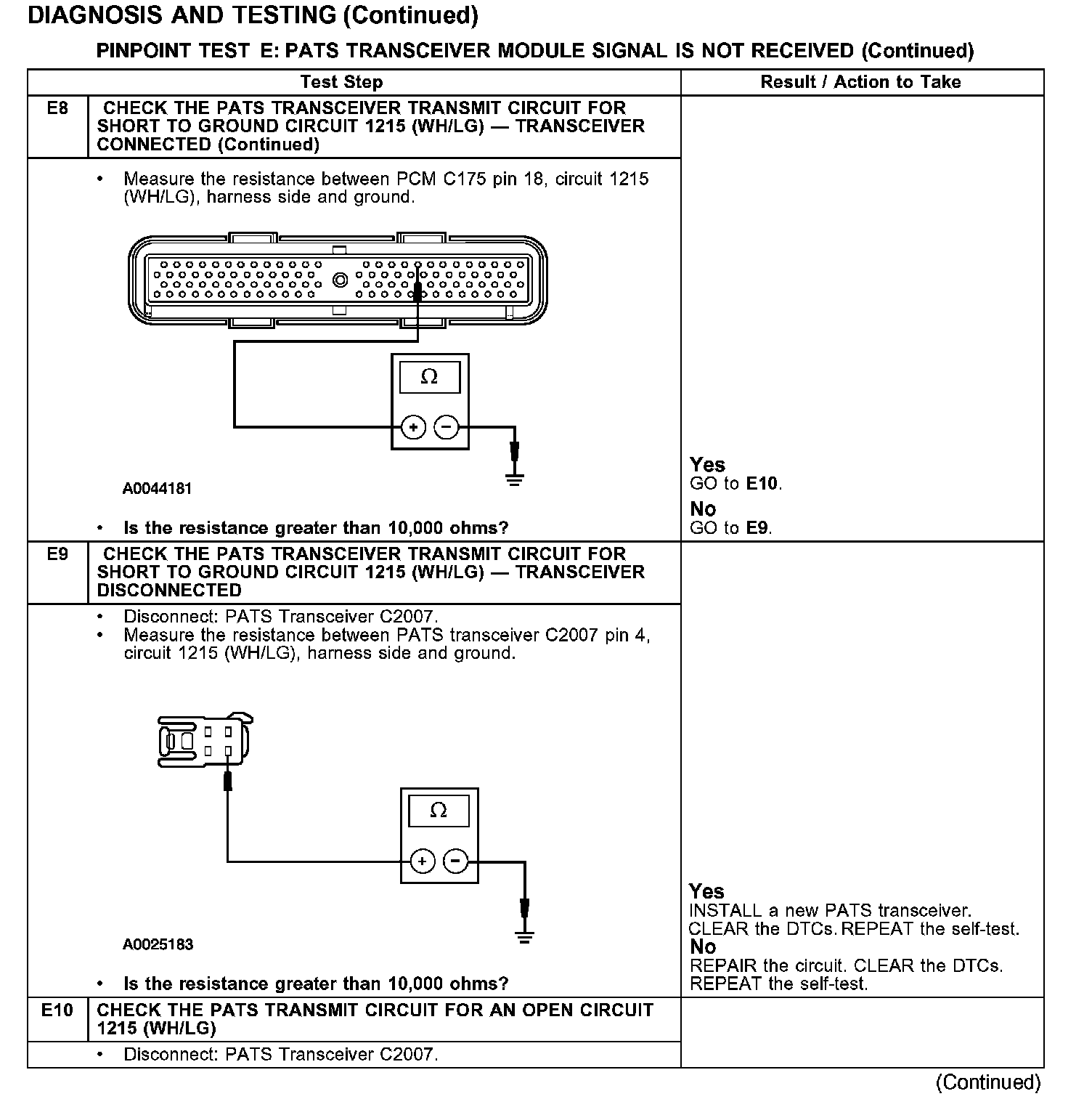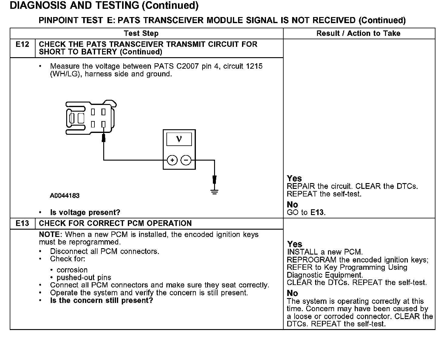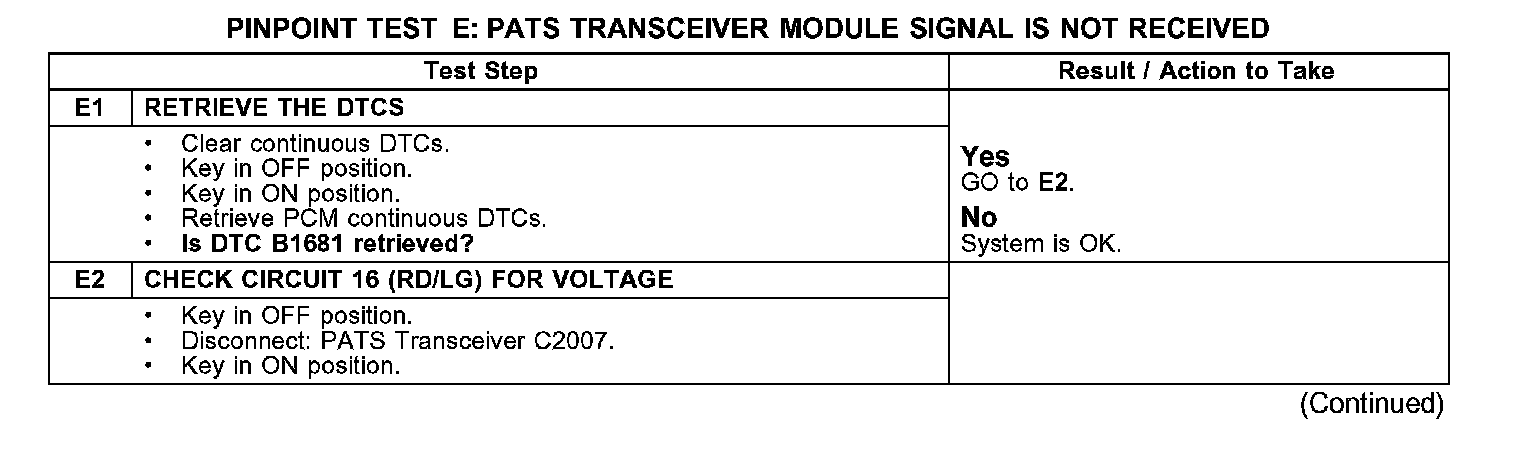 PINPOINT TEST E: PATS TRANSCEIVER MODULE SIGNAL IS NOT RECEIVED