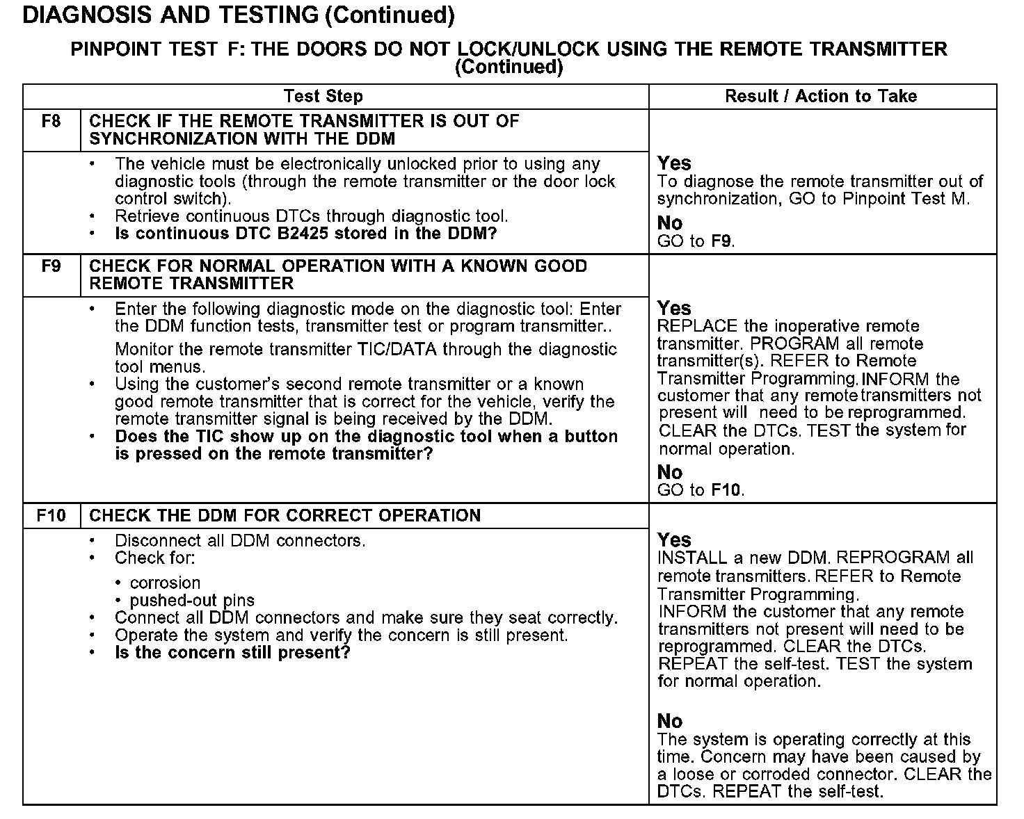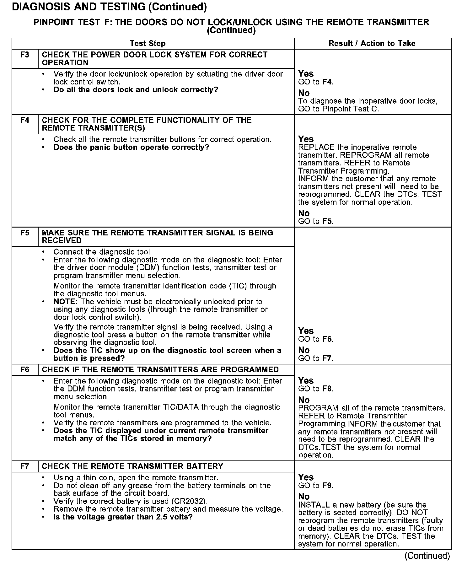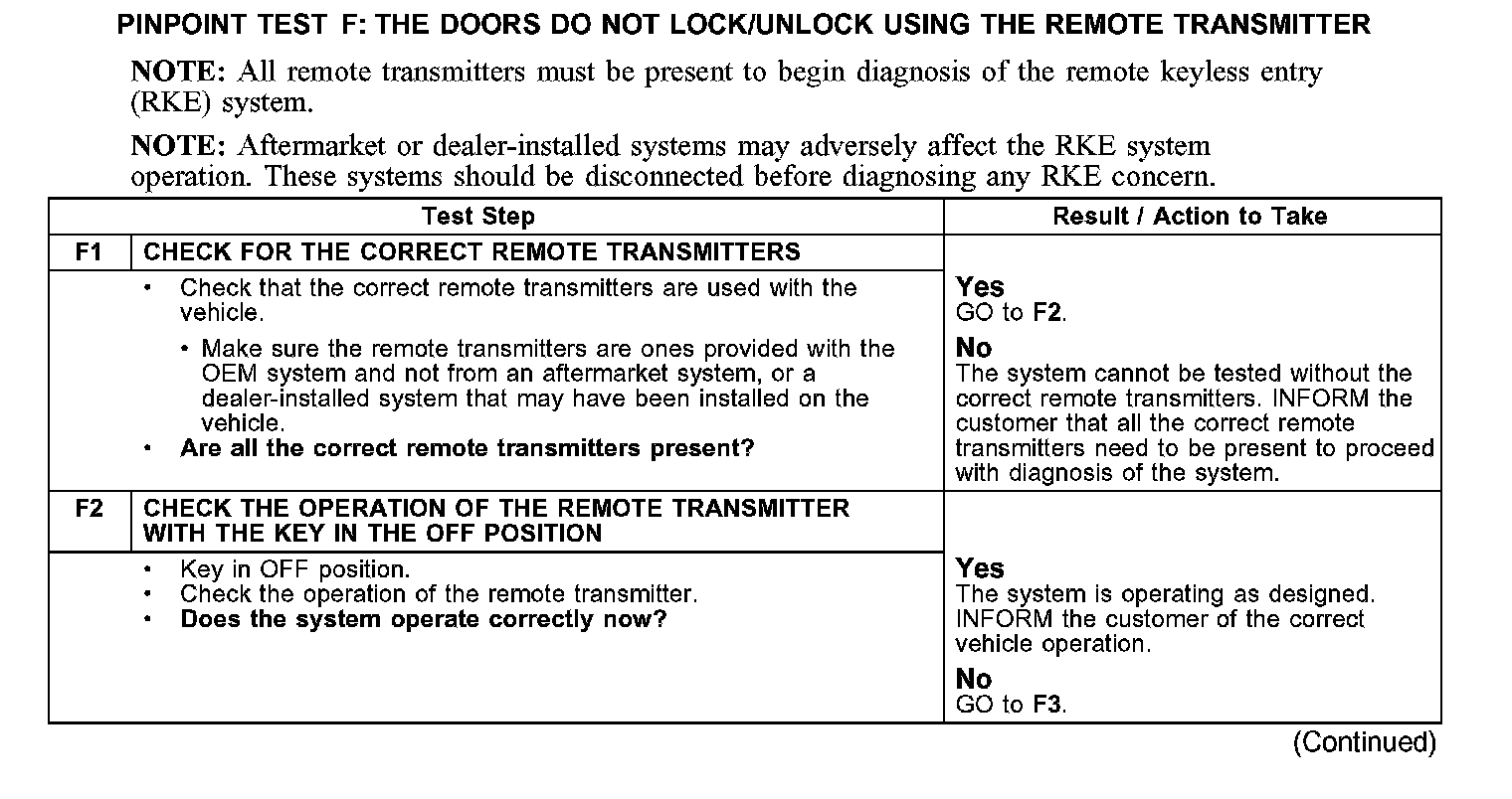 PINPOINT TEST F: THE DOORS DO NOT LOCK/UNLOCK USING THE REMOTE TRANSMITTER