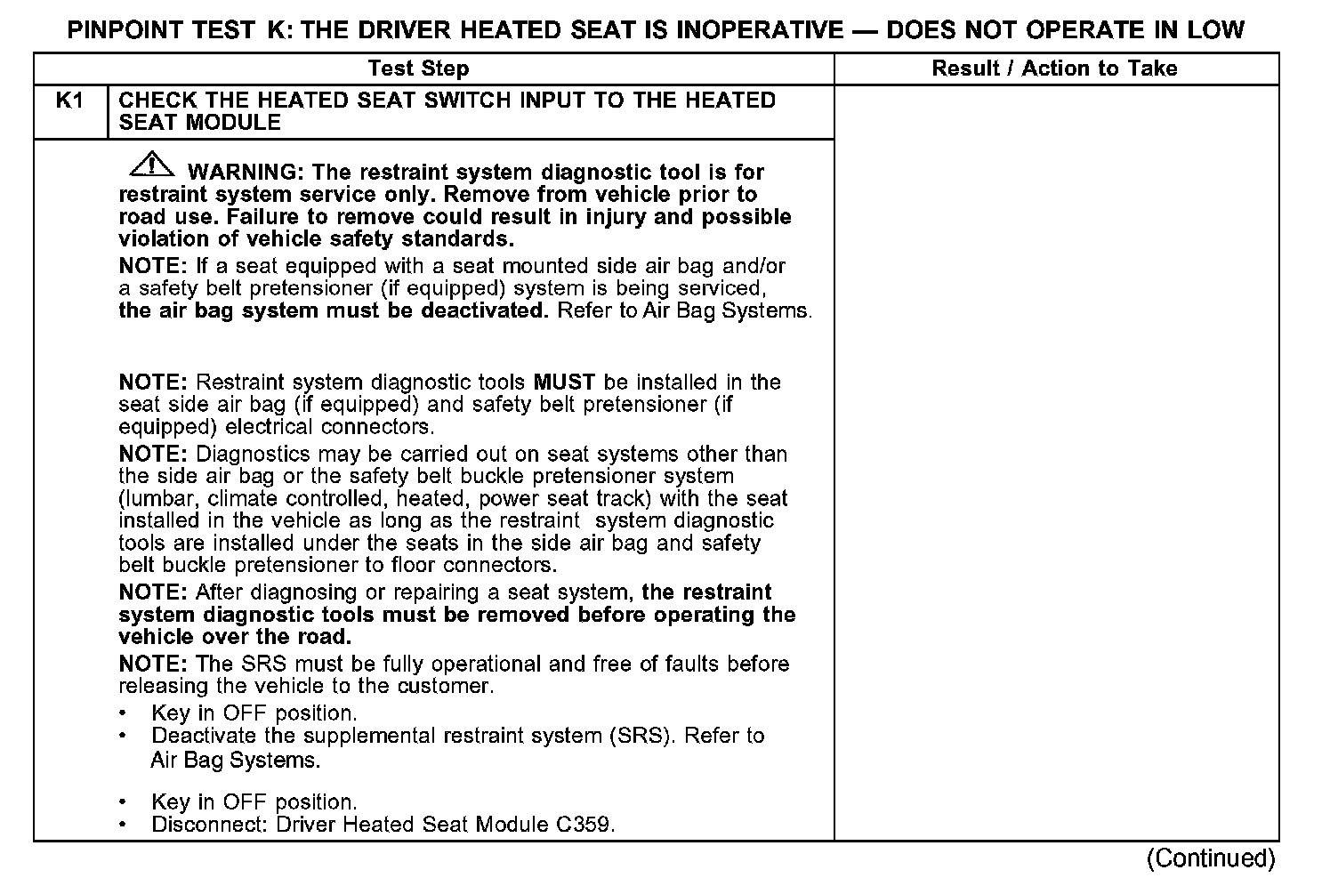 PINPOINT TEST K: THE DRIVER HEATED SEAT IS INOPERATIVE - DOES NOT OPERATE IN LOW
