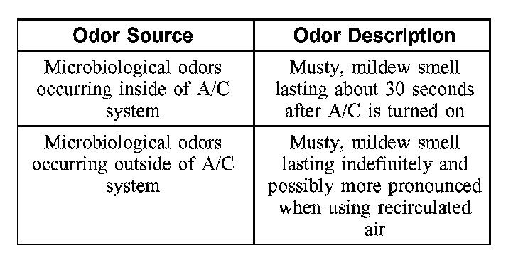 1. Identify the type of odor present in the vehicle. Do not proceed with A/C odor treatment if the odor source is found to be outside of the A/C system. Refer to the chart for examples.
