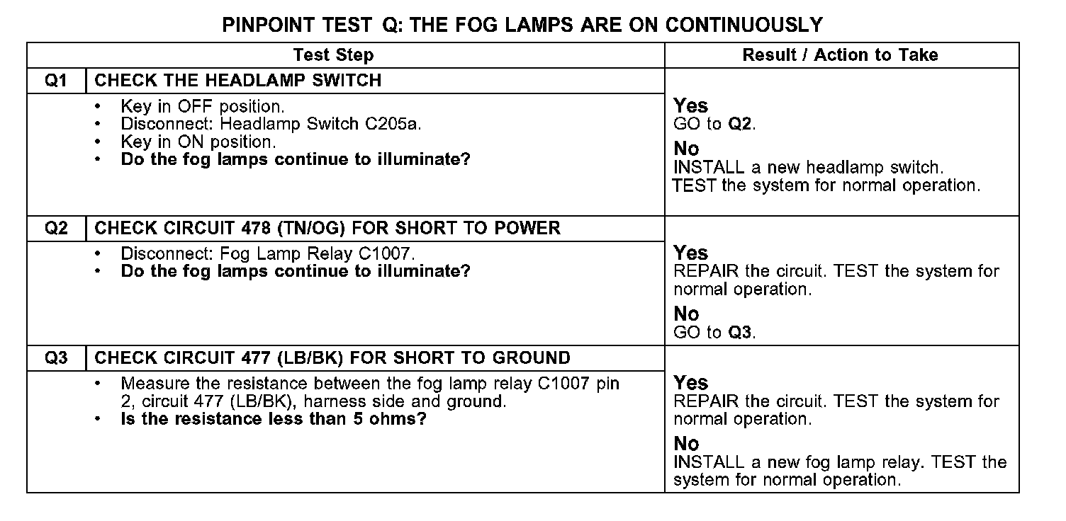 PINPOINT TEST Q: THE FOG LAMPS ARE ON CONTINUOUSLY