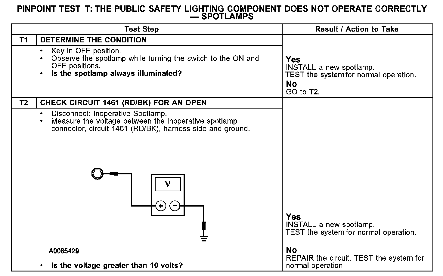 PINPOINT TEST T: THE PUBLIC SAFETY LIGHTING COMPONENT DOES NOT OPERATE CORRECTLY - SPOTLAMPS