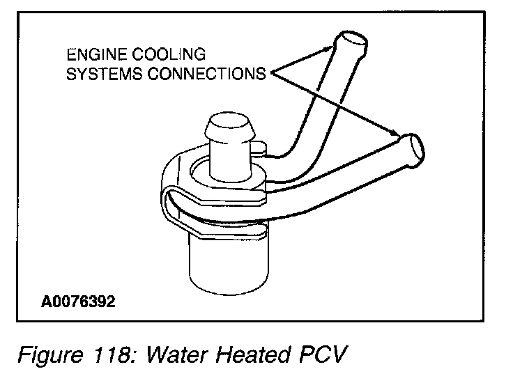 Currently, Ford uses heated and non-heated PCV valves. The purpose of the PCV heater is to prevent the PCV valve from freezing in cold ambient temperatures. Heated PCV valves are heated either by water or electric. Water heated systems use engine coolant to heat the valve to prevent freezing. Electrically heated systems use a heating element enclosed in the PCV valve to prevent the valve from freezing. Ford currently uses two types of electrically heated PCV valve systems: