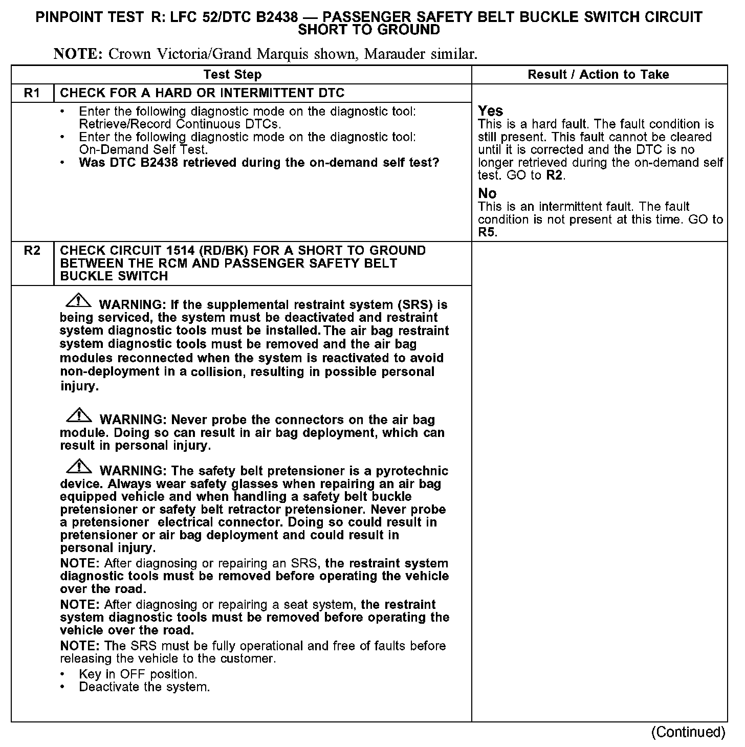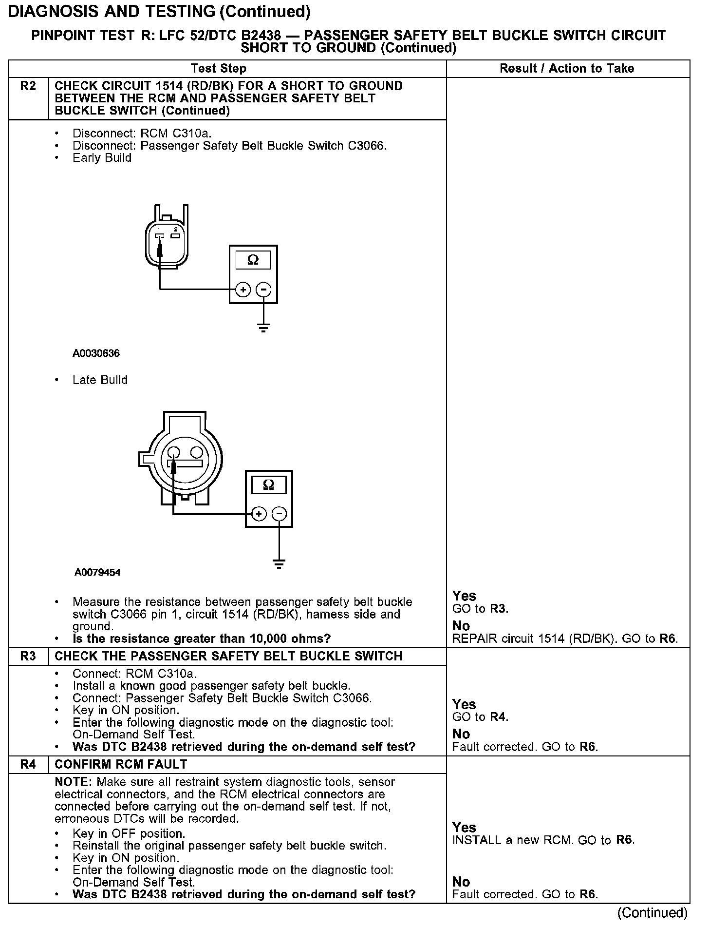 PINPOINT TEST R: LFC 52/DTC B2438 - PASSENGER SAFETY BELT BUCKLE SWITCH CIRCUIT SHORT TO GROUNDTest R1-R2: