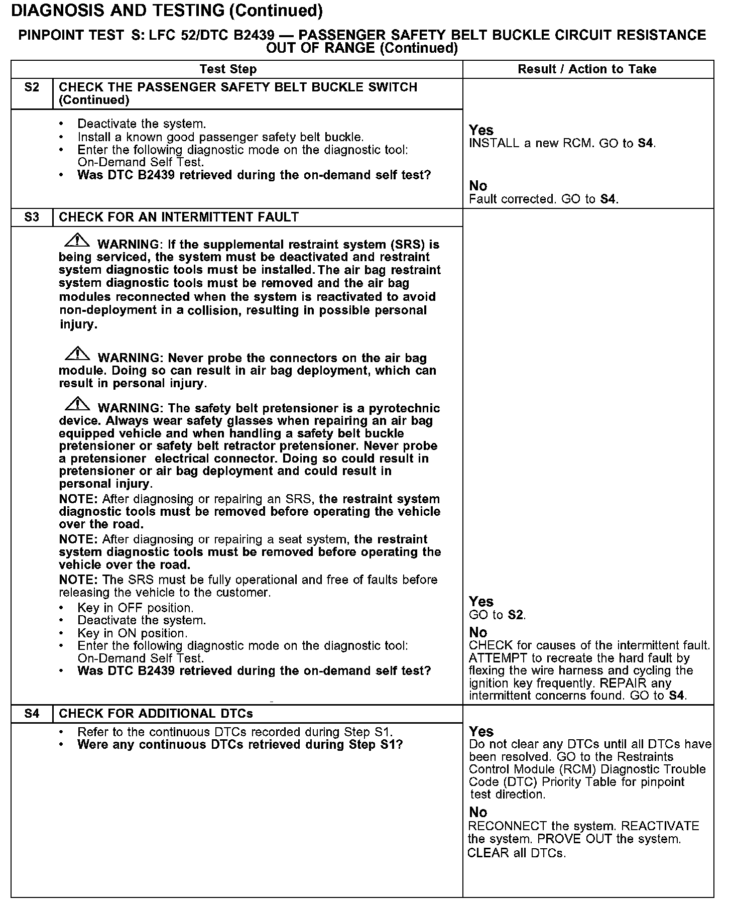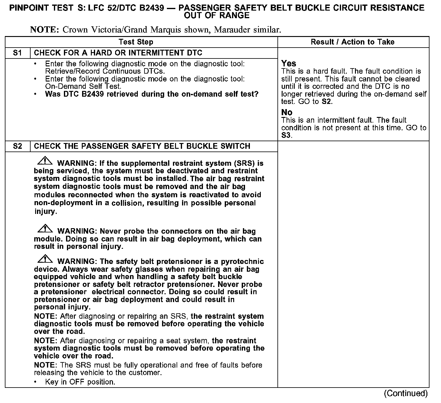 PINPOINT TEST S: LFC 52/DTC B2439 - PASSENGER SAFETY BELT BUCKLE SWITCH CIRCUIT RESISTANCE OUT OF RANGE