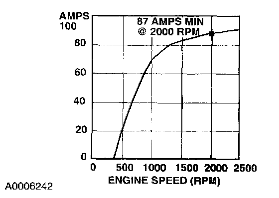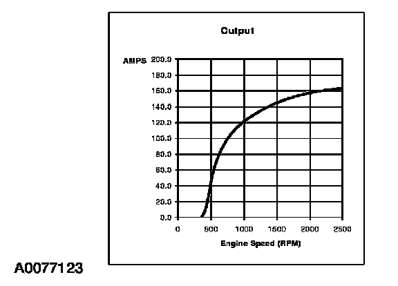 4. With the engine running at 2.000 rpm, adjust the tester load bank to determine the output of the generator. Generator output should be greater than the applicable graphs shown. If not, refer back to the pinpoint test or to the Symptom Chart. Pinpoint Tests Symptom Related Diagnostic Procedures
