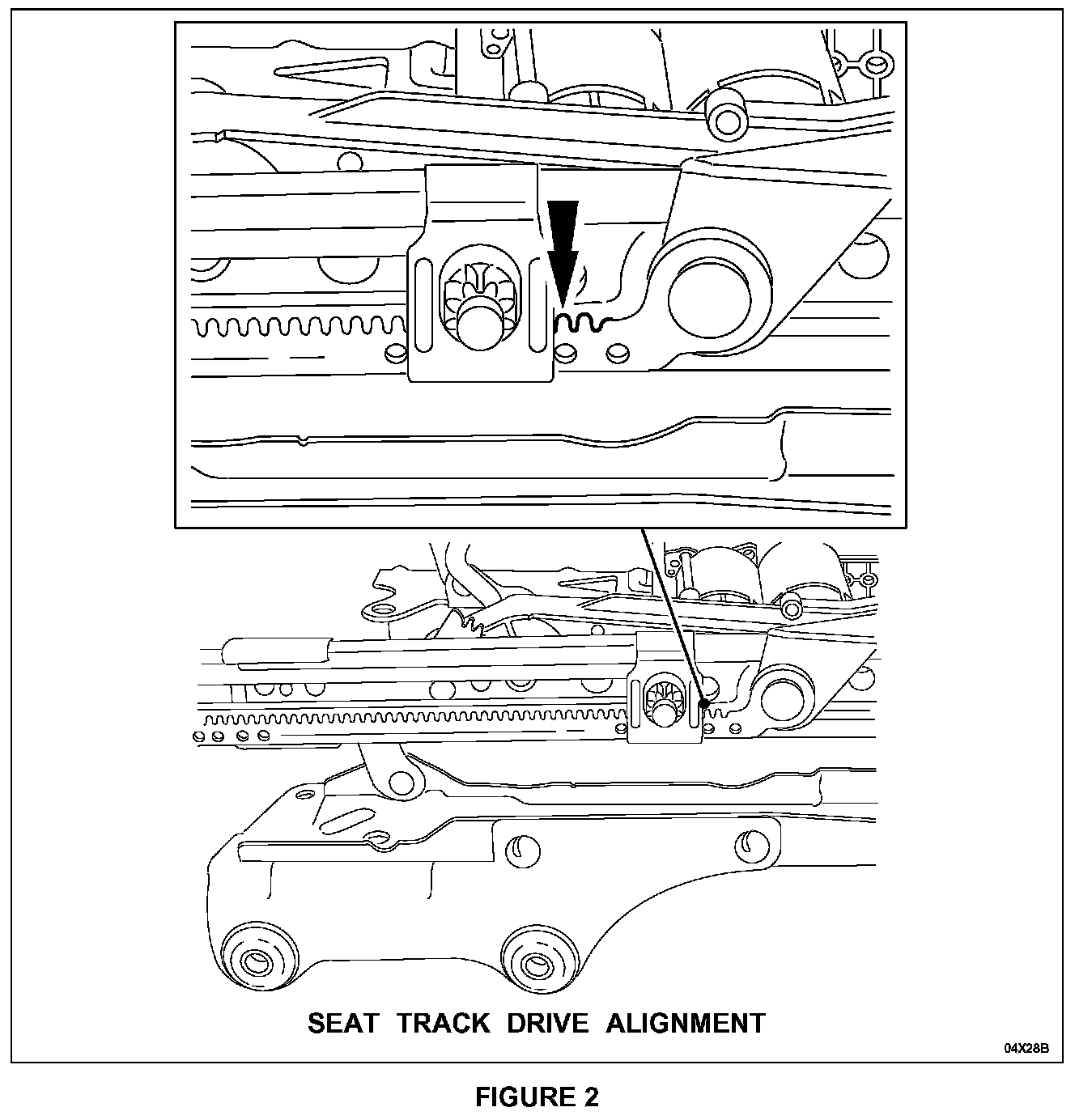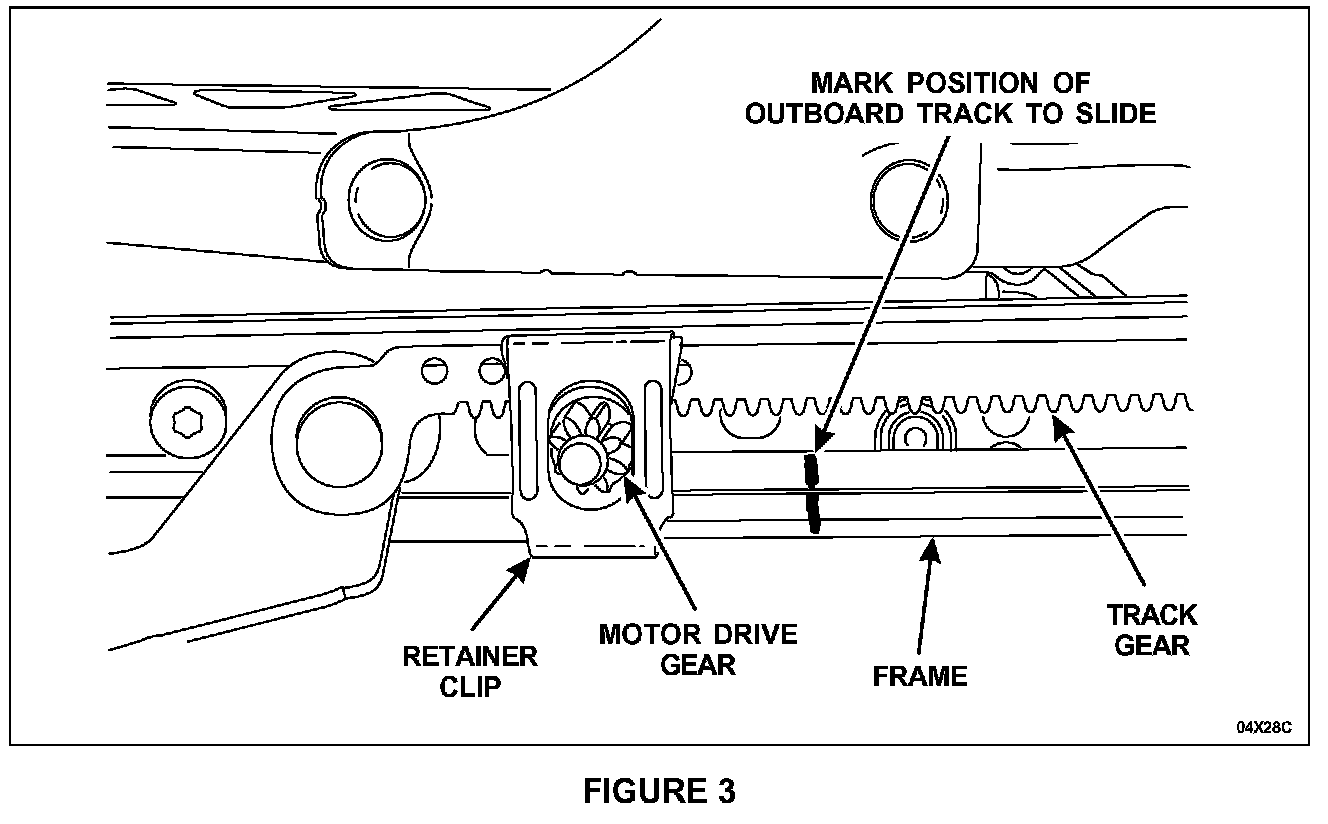 Position the seat track horizontally by applying power and ground to the seat track motor pins. Position the outboard track most of the way forward so that two teeth are showing next to the outboard retainer clip and a flat spot on the drive tube (not shown) is positioned upward. See Figure 2.