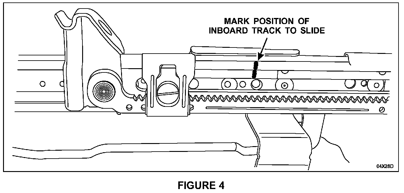14. Check to make sure the index marks on the inboard track C-channel and plastic-coated slide are still in alignment. The index marks on the inboard track C-channel and plastic-coated slide must align at this step. If the index marks do not match up, repeat Steps 10 through 12. See Figure 4.