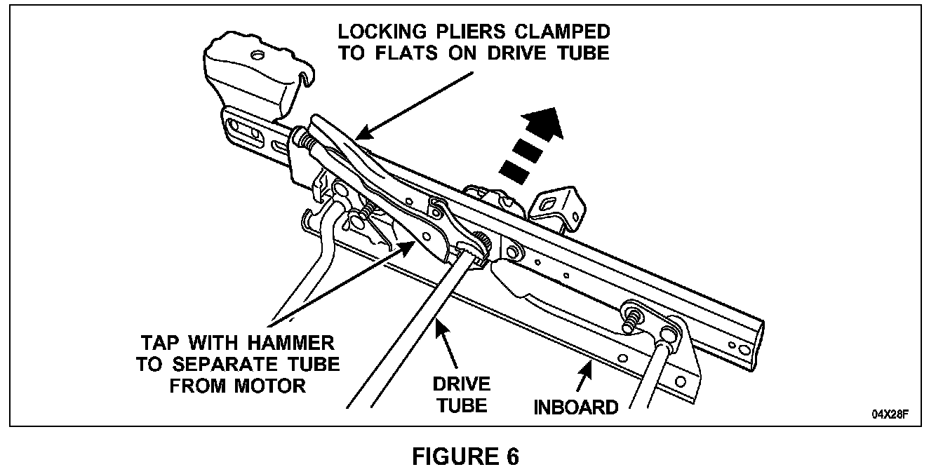 Clamp the locking pliers on the flats of the drive tube where it reaches over the inboard track gear stub shaft. Tap on the locking pliers, separate the drive tube from the seat track motor assembly stub shaft and remove the inboard track and drive tube. See Figure 6.