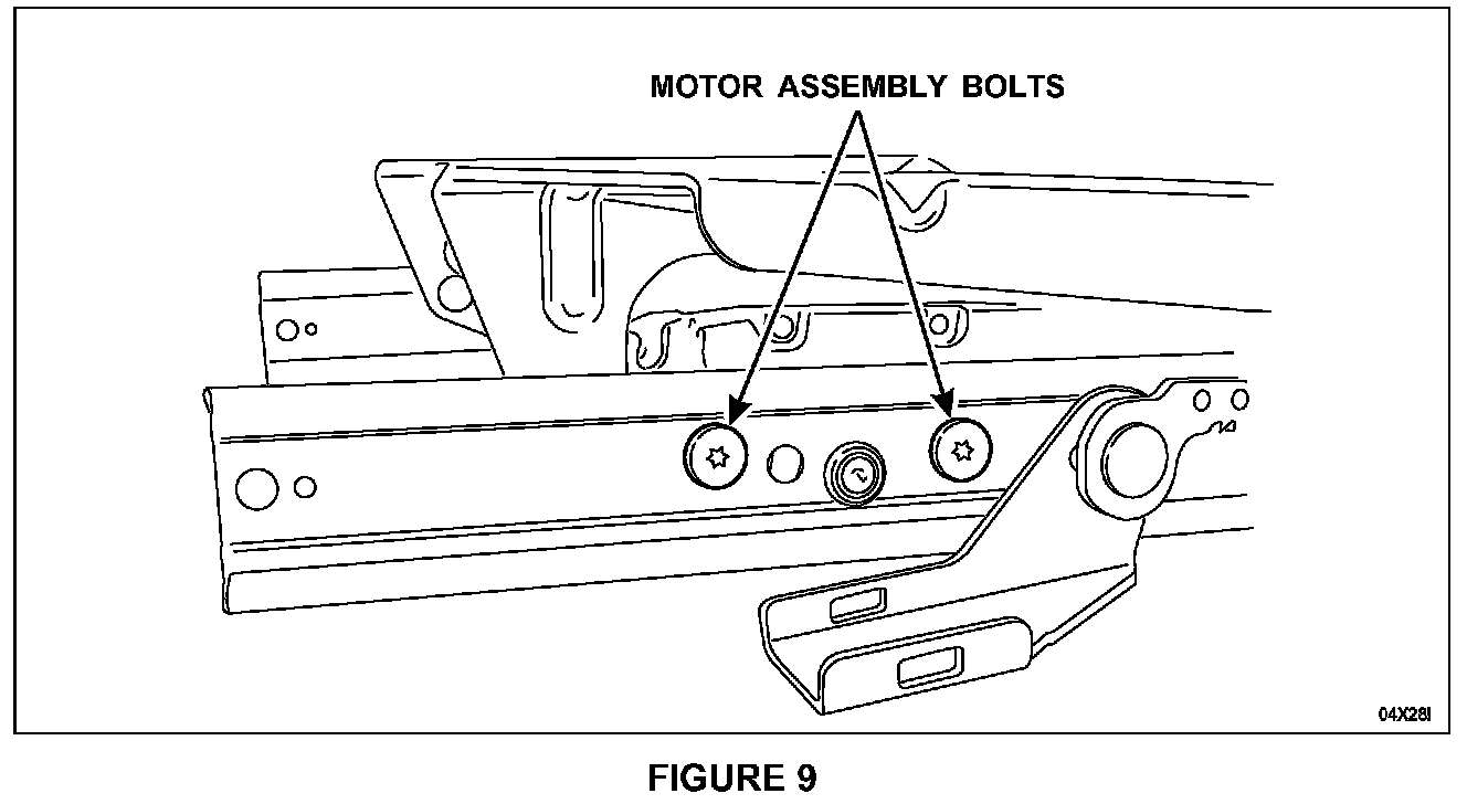 Install the two (2) bolts holding the seat track motor assembly to the outboard track. Tighten to 12 Nm (9 lb-ft). See Figure 9.