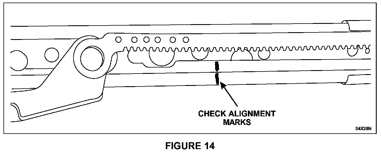 3. Check to make sure the index marks on the outboard track C-channel and plastic-coated slide are still in alignment. If necessary, slide the track to realign the marks. See Figure 14.