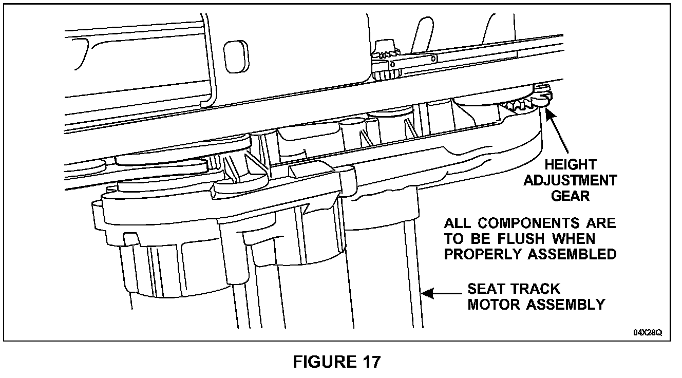 6. When assembled, make sure the outboard track, support straps, front and rear height adjustment gears and seat track motor assembly all fit flush against each other. Make sure the support straps and seat track motor assembly gear bushing alignment pins fit into the track openings. See Figure 17.