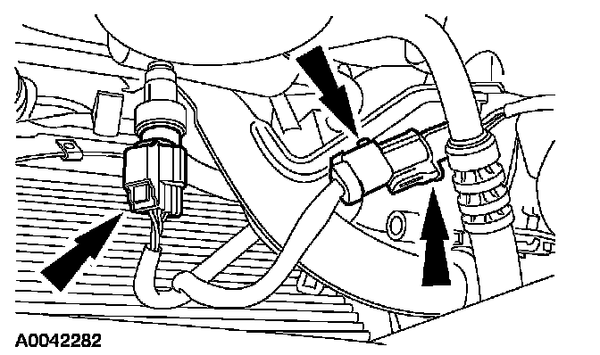 5. NOTE: It may be necessary to raise and lower the vehicle several times to route the compressor manifold and tube assembly through the opening between the upper radiator support and the engine.