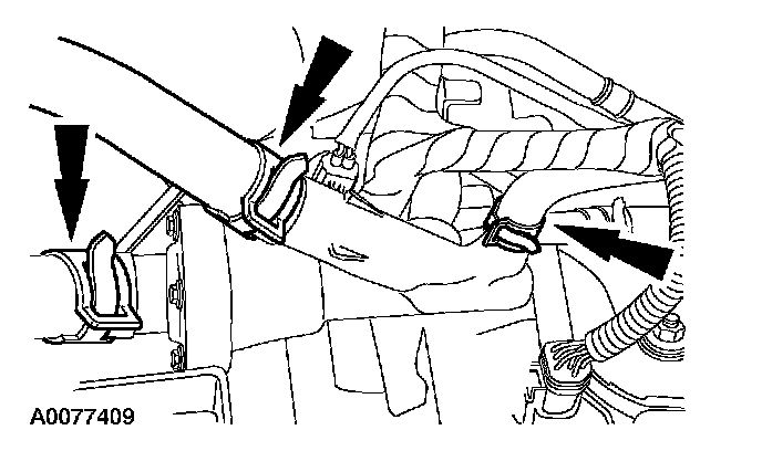 5. Disconnect the upper radiator hose, the thermostat housing hose and the heater hose.