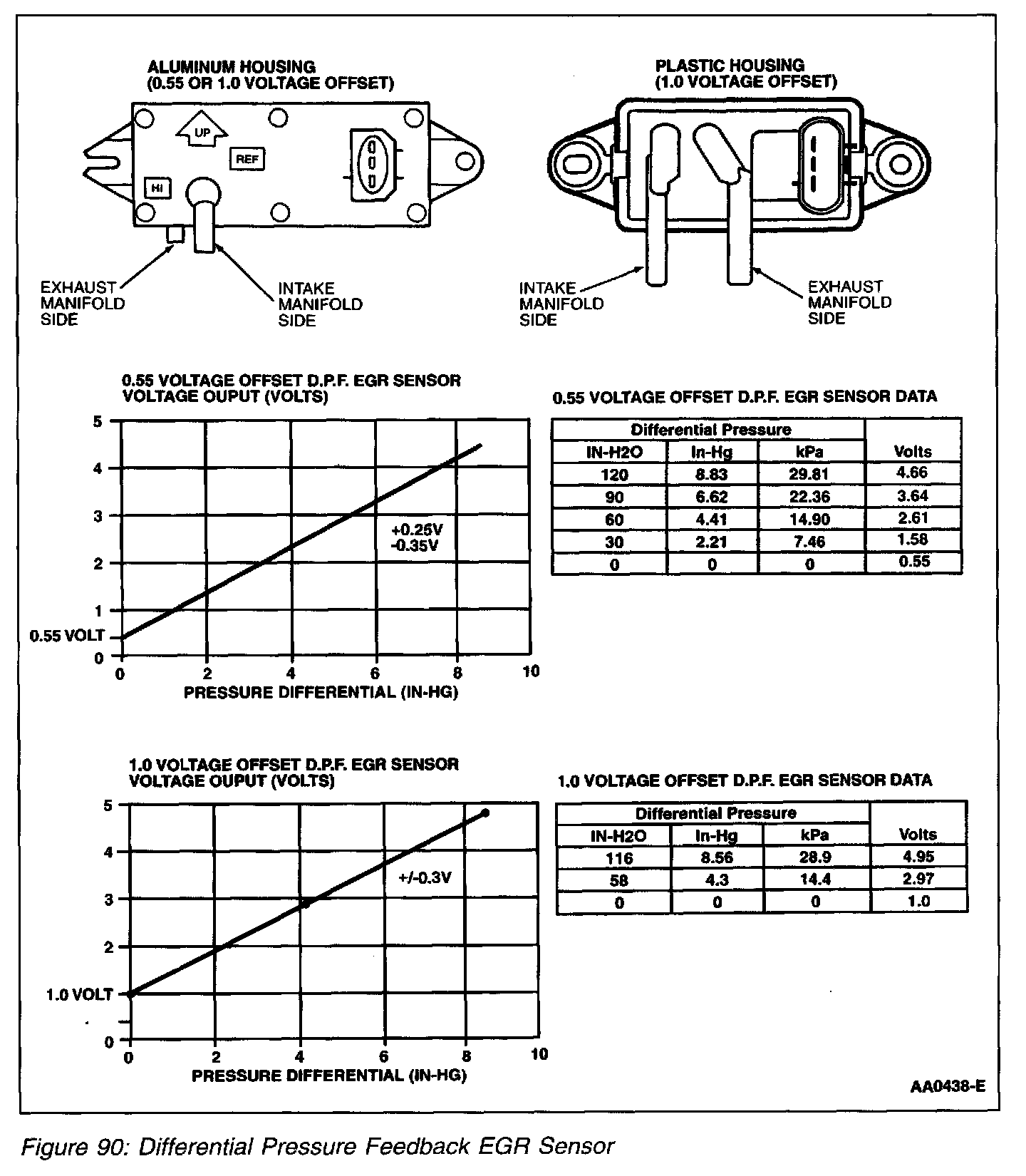 The tube mounted differential pressure feedback EGR sensor (Figure 91) is identical in operation as the larger metal or plastic DPFE sensors and uses a 1.0 volt offset. The HI and REF hose connections are marked on the underside of the sensor.